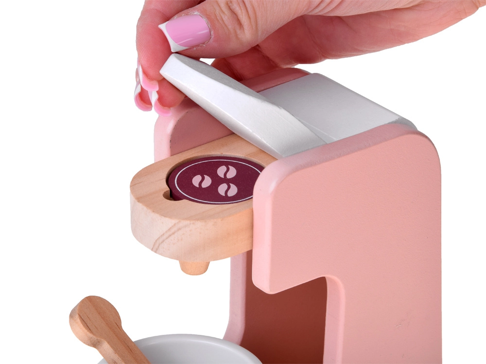 Kapsel einlegen, Hebel betätigen und „Kaffee“ servieren. Das sichere Design mit glatten Kanten unterstützt soziales Spielen und Café-Rollenszenarien.