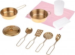 Im Lieferumfang enthalten ist ein Set an Geschirr und Zubehör, damit das Spiel sofort beginnen kann: Metalltopf und Stielkasserolle mit Deckel, Schöpflöffel, Schaumlöffel, Pfannenwender, Pasta-Zange, Plastikbecher, Schwamm und rosa Tuch. Unterschränke und Regale bieten viel Platz zur Aufbewahrung von Lebensmitteln und Zubehör.
