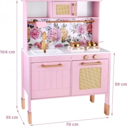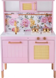 Diese Retro-Holzküche in zartem Rosa kombiniert robuste Materialien mit schönen Details: goldene Griffe, floraler Hintergrund und stabile Füße. Kinder haben Spaß am Nachahmen der Erwachsenen dank leuchtender Kochfelder mit Koch- und Brateffekt, drehbarer Knöpfe mit Klickgeräusch und Spülbecken mit goldener Armatur.