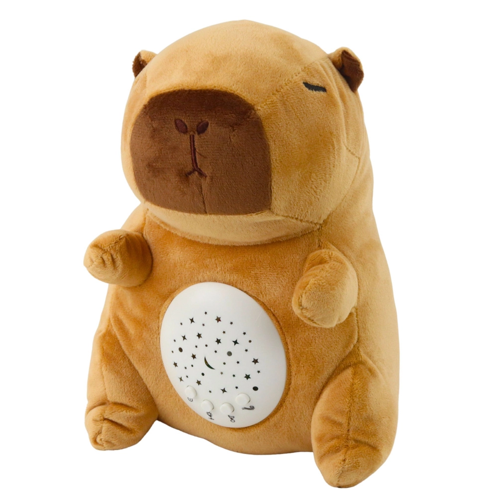 Die Plüsch-Capybara zaubert eine märchenhafte Sternen- und Mondprojektion an Wände und Decke, deren Helligkeit sich in drei Stufen leicht anpassen lässt – von sanft gedimmt bis deutlich heller. Das integrierte Modul spielt 8 beruhigende Melodien und Naturklänge ab, die Entspannung fördern und schnelleres Einschlafen unterstützen.