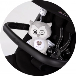 Dank der praktischen Schlaufe lässt sich die Eule schnell am Bügel des Kinderwagens oder am Bettrand befestigen – immer griffbereit.