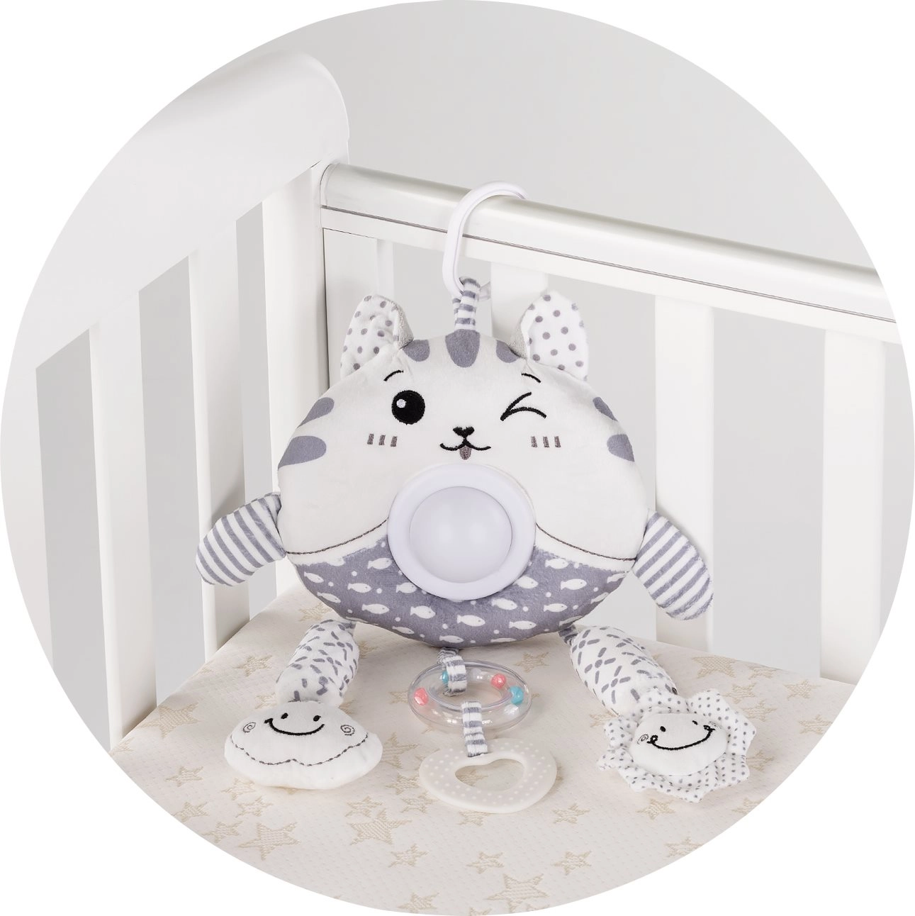 Die Plüschkatze Big Kitty ist der ideale Begleiter für Ihr Baby – sie beruhigt, unterhält und fördert die Sinneswahrnehmung. Dank des universellen Hakens lässt sie sich leicht am Kinderwagen, an der Babyschale oder am Bettchen befestigen. Angenehme Materialien, sanfte Farben und Lichteffekte schaffen eine behagliche Atmosphäre zum Spielen und Einschlafen.