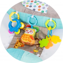 Aufhängeringe und weiche Spielzeuge animieren zum Greifen und Schütteln und fördern so die Feinmotorik und die Sinneswahrnehmung.