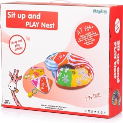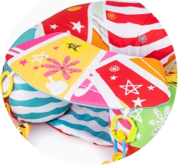 Dank weicher und stabiler Füllung bietet es sicheren Halt, während farbenfrohe Muster und interaktive Elemente die Sinne und die Hand-Auge-Koordination fördern. Das praktische Material lässt sich leicht reinigen und ist somit bereit für tägliche Abenteuer.
