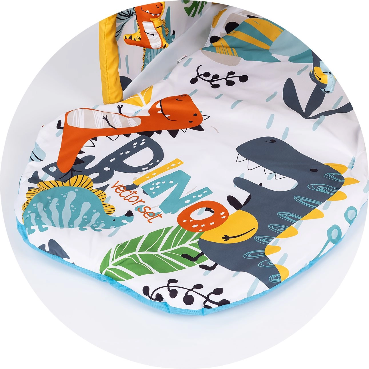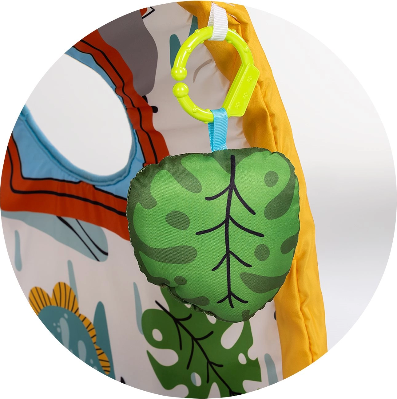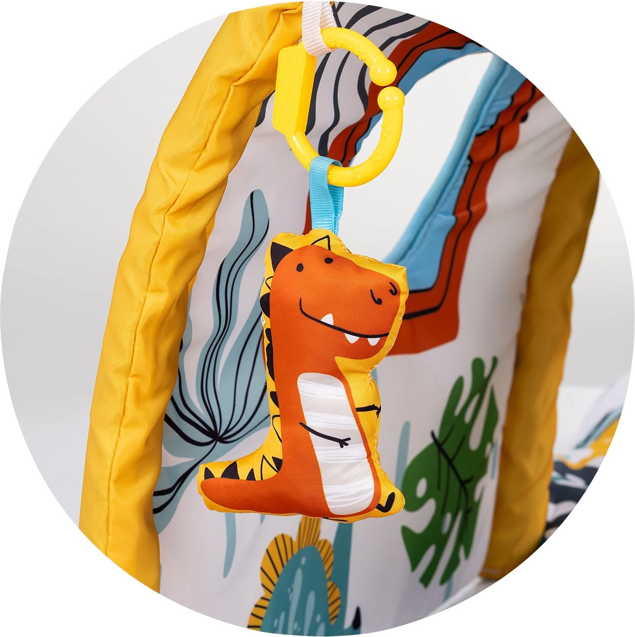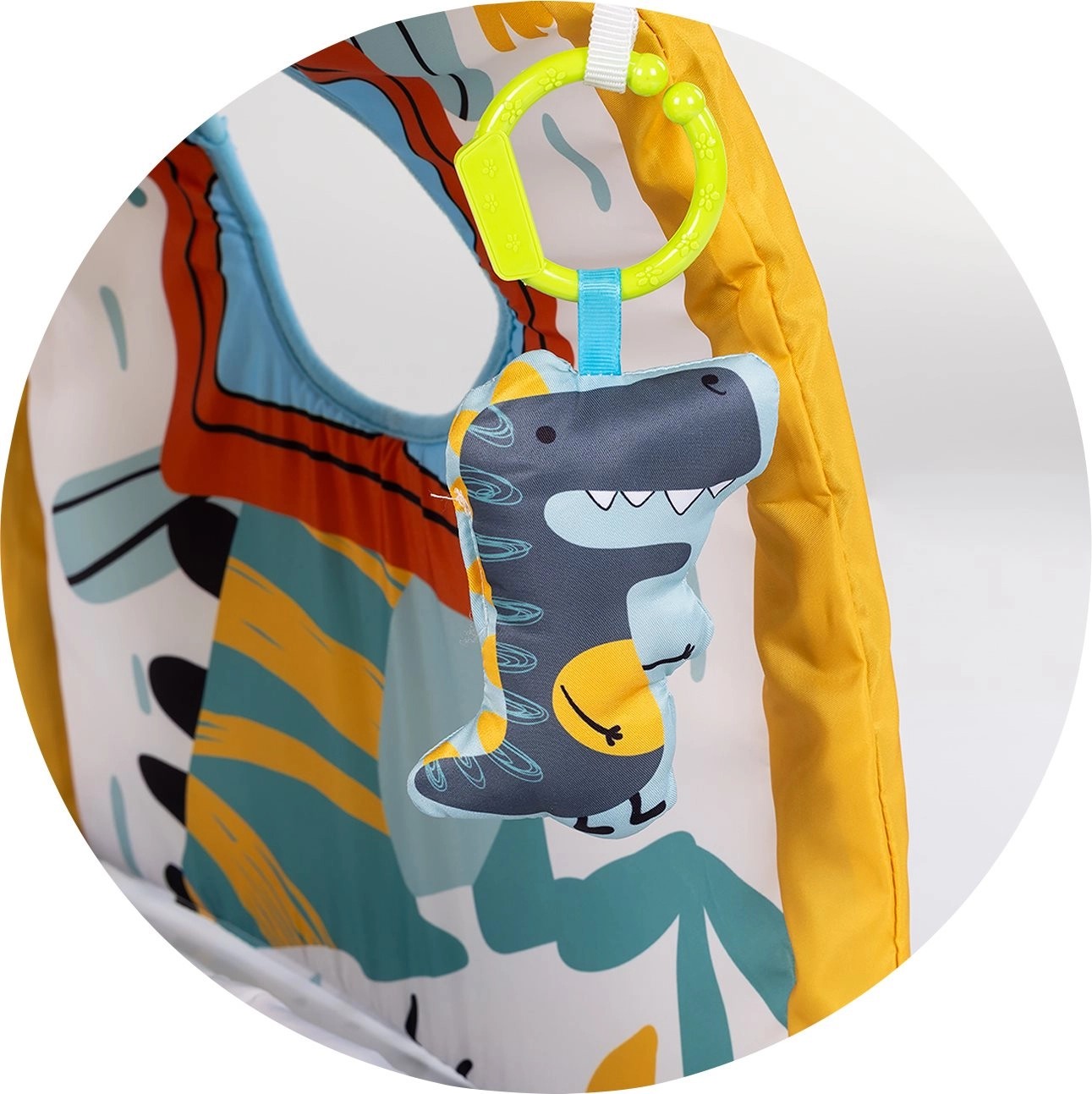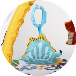 Die gepolsterte Unterlage mit Bogen und hängenden Spielzeugen motiviert das Baby zum Greifen und stärkt die Hand-Auge-Koordination.
