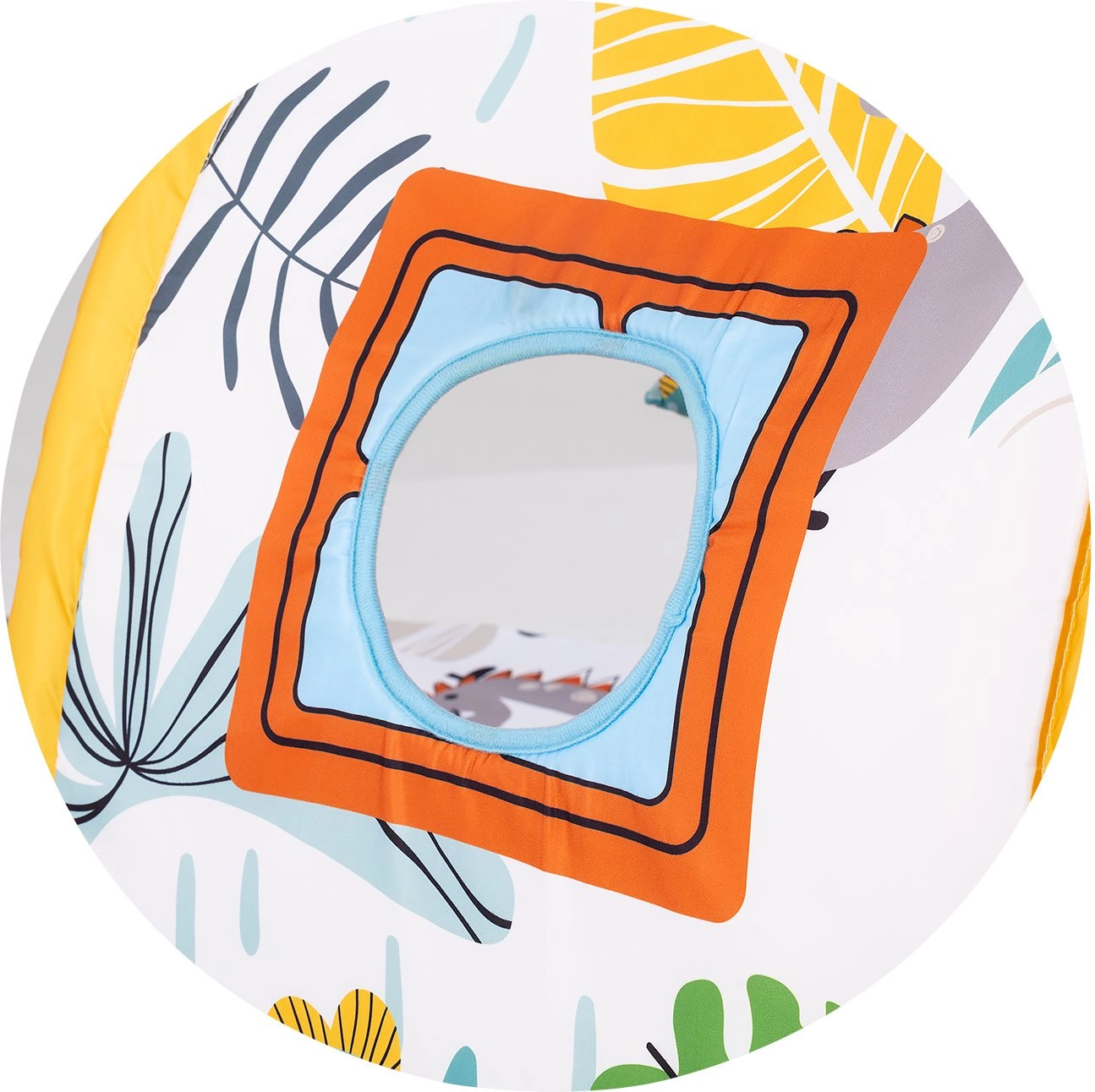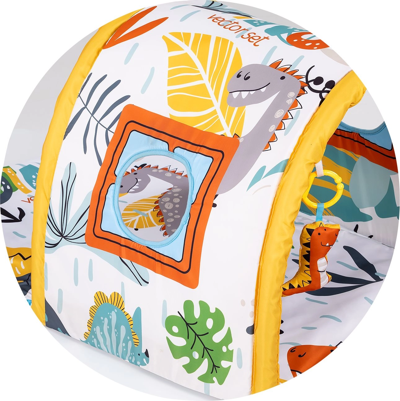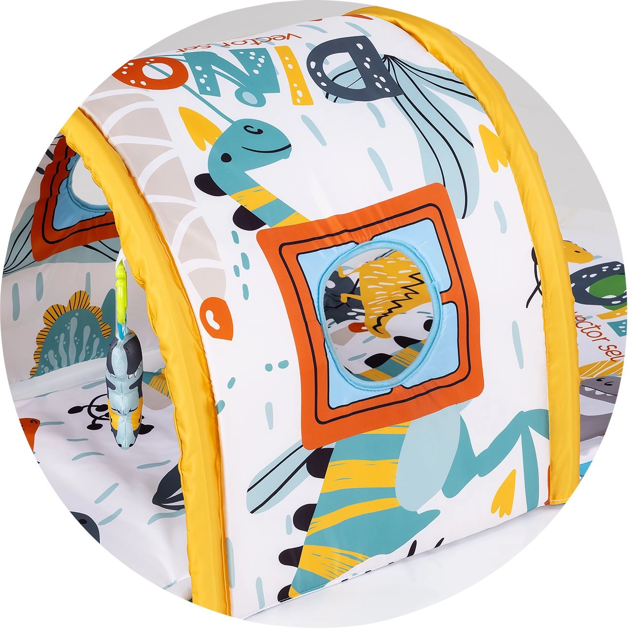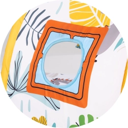 Dank der sicheren und komfortablen Ausführung bietet die Decke einen angenehmen Platz zum Spielen in Bauch- und Rückenlage. Fenster und Details am Tunnel laden zum Hineinschauen und Verstecken ein, was Neugier und Vorstellungskraft fördert. Farbenfrohe Elemente und Texturen bieten reiche Reize für die sensorische Entwicklung und erste soziale Interaktionen mit den Eltern.