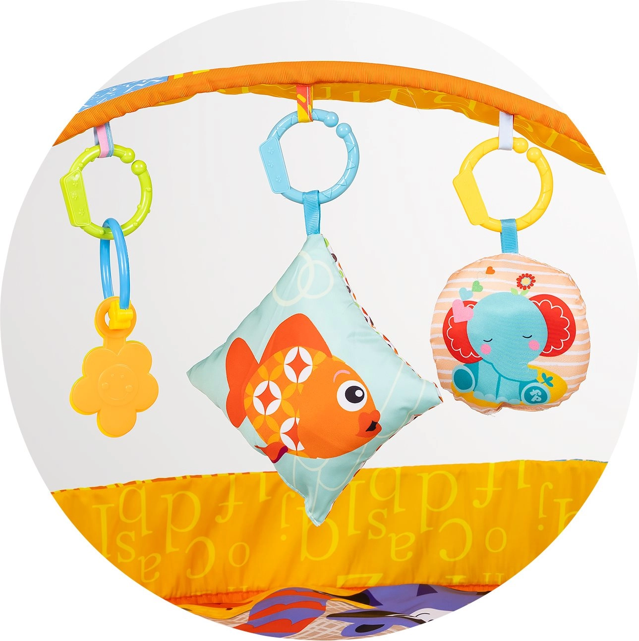 Zwei sich kreuzende Bögen mit weichem und Kunststoff-Spielzeug, Rasseln und einem Beißring motivieren das Baby zum Greifen und Ausstrecken.