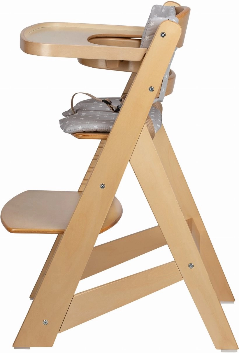 Das abnehmbare Tablett und der hölzerne Sicherheitsbügel ermöglichen einen einfachen Wechsel vom Hochstuhl zum Stuhl am Tisch. Der integrierte 3-Punkt-Gurt und die bequeme Polsterung erhöhen Sicherheit und Komfort auch bei längerem Sitzen.