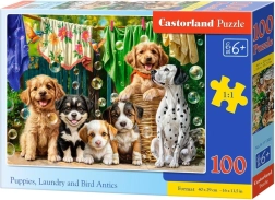 Entdecken Sie die Magie des Puzzelns mit dem charmanten Motiv „Welpen, Wäsche und Vogeltreiben“. Das CASTORLAND Puzzle überzeugt mit passgenauen Stanzungen und satten Farben, die bei jedem Puzzelerlebnis Freude bereiten. Das zusammengesetzte Bild mit einem Maß von ca. 40 × 29 cm eignet sich hervorragend zum Ausstellen im Kinderzimmer.