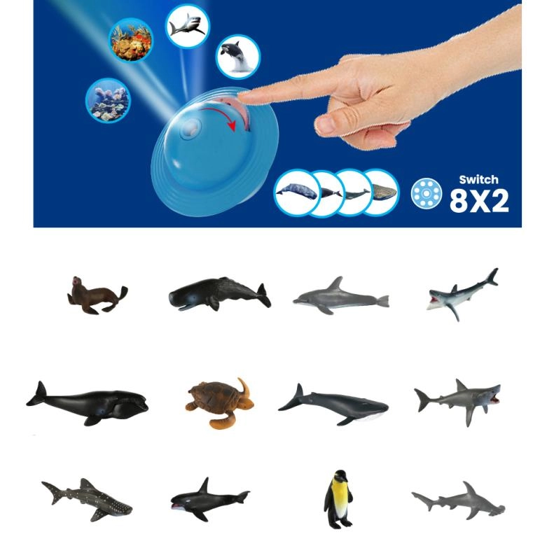Das Set verbindet Licht, Farben und echte Tiermodelle, sodass Kinder Bilder leicht mit der Realität verknüpfen. Ein Projektor mit zwei Scheiben wirft Meeresmotive an Wand oder Decke, die sich angenehm betrachten lassen und zum Geschichtenerzählen inspirieren.