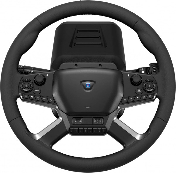 Das 40‑cm‑Lenkrad mit Kunstlederoberfläche und 1800° Lenkeinschlag vermittelt ein authentisches Fahrgefühl schwerer Nutzfahrzeuge – auf der Straße wie im Depot.