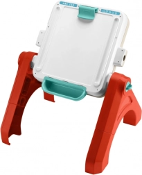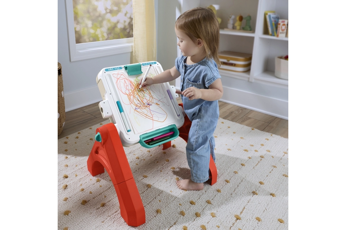 Vom Sitzen über das Stehen bis zum eigenständigen Gestalten. Der Tisch lässt sich im Handumdrehen in einen offenen Spieletisch oder eine stehende Staffelei für kleine Künstler verwandeln.