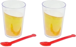 Mit dabei sind Trauben, Apfel und Orange, zwei Becher mit Löffeln sowie eine Eiswürfelform für realistische Smoothie-Szenarien.