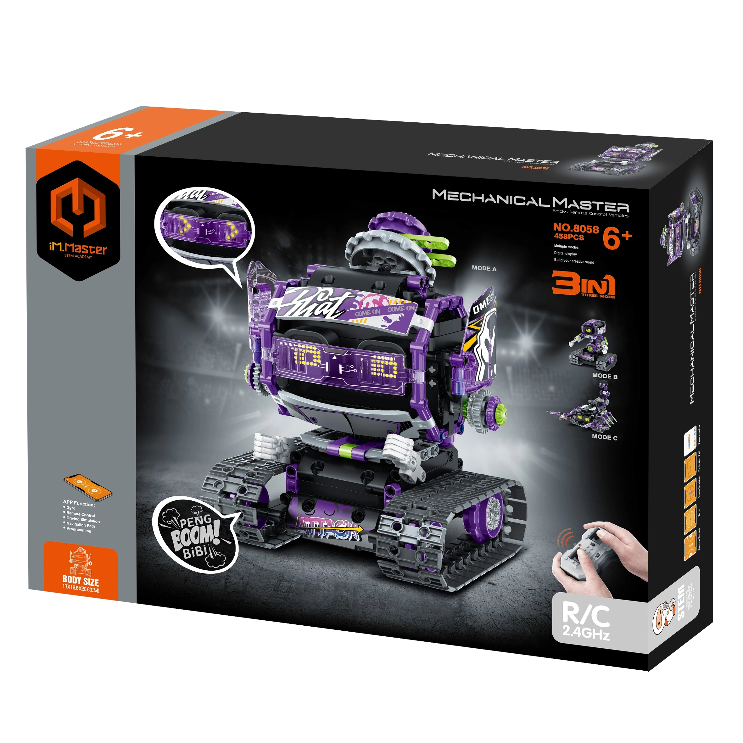 Der unterhaltsame 3-in-1 RC-Roboter-Bausatz von iM.Master bietet stundenlange kreative Unterhaltung für Kinder und Erwachsene. Aus den einzelnen Teilen bauen Sie gleich drei Varianten, und dank der Fernsteuerung fährt und bewegt sich der Roboter wirklich. Kompakte Abmessungen von 17 × 16,6 × 20,6 cm und die einfache Bedienung sorgen für bequemes Spielen. Das ideale Geschenk für Technikfans und Konstruktionsset-Liebhaber mit Fokus auf Kreativität, Förderung der Feinmotorik und spaßige Fernsteuerung.