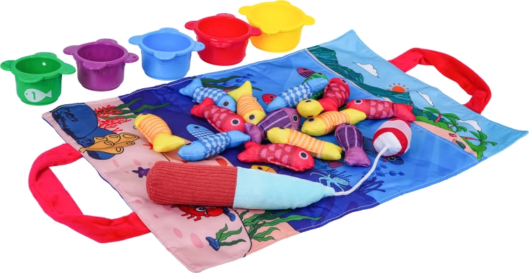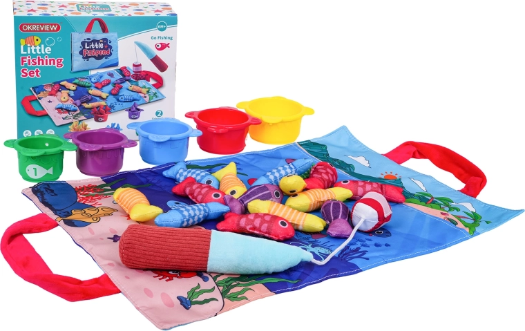 Entdecken Sie eine spielerische Aktivität für die Kleinsten: ein weiches Angelset mit Stoffmatte, 15 Fischen, 5 Bechern und einer weichen Klett-Angelrute. Fördert die Feinmotorik, die Hand-Auge-Koordination, das Farben- und Zahlenerkennen sowie Sortieren und Zählen. Die praktische Matte mit Tragegriffen dient zugleich als Tasche zur Aufbewahrung des gesamten Sets.
