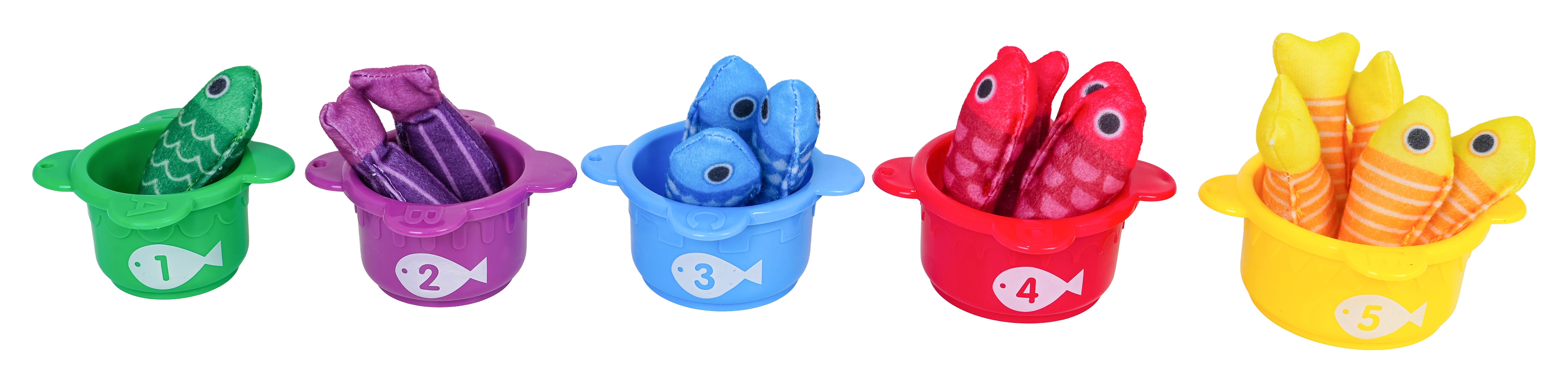Fünf Becher mit den Zahlen 1–5 und farblich passende Fische lehren Kinder das Sortieren nach Farben und einfaches Zählen. Ideal zur Förderung von Logik und vorschulischen Fähigkeiten.