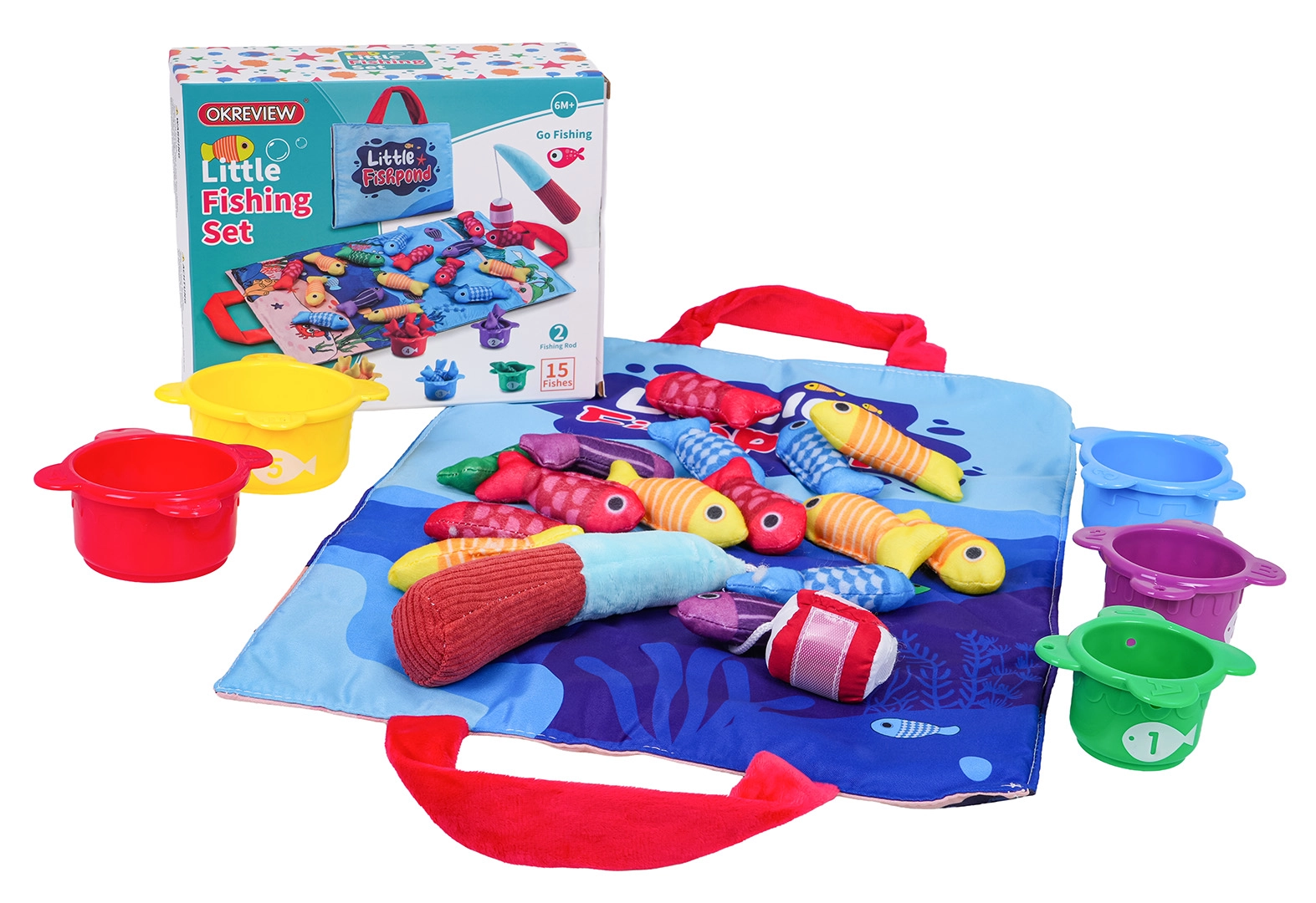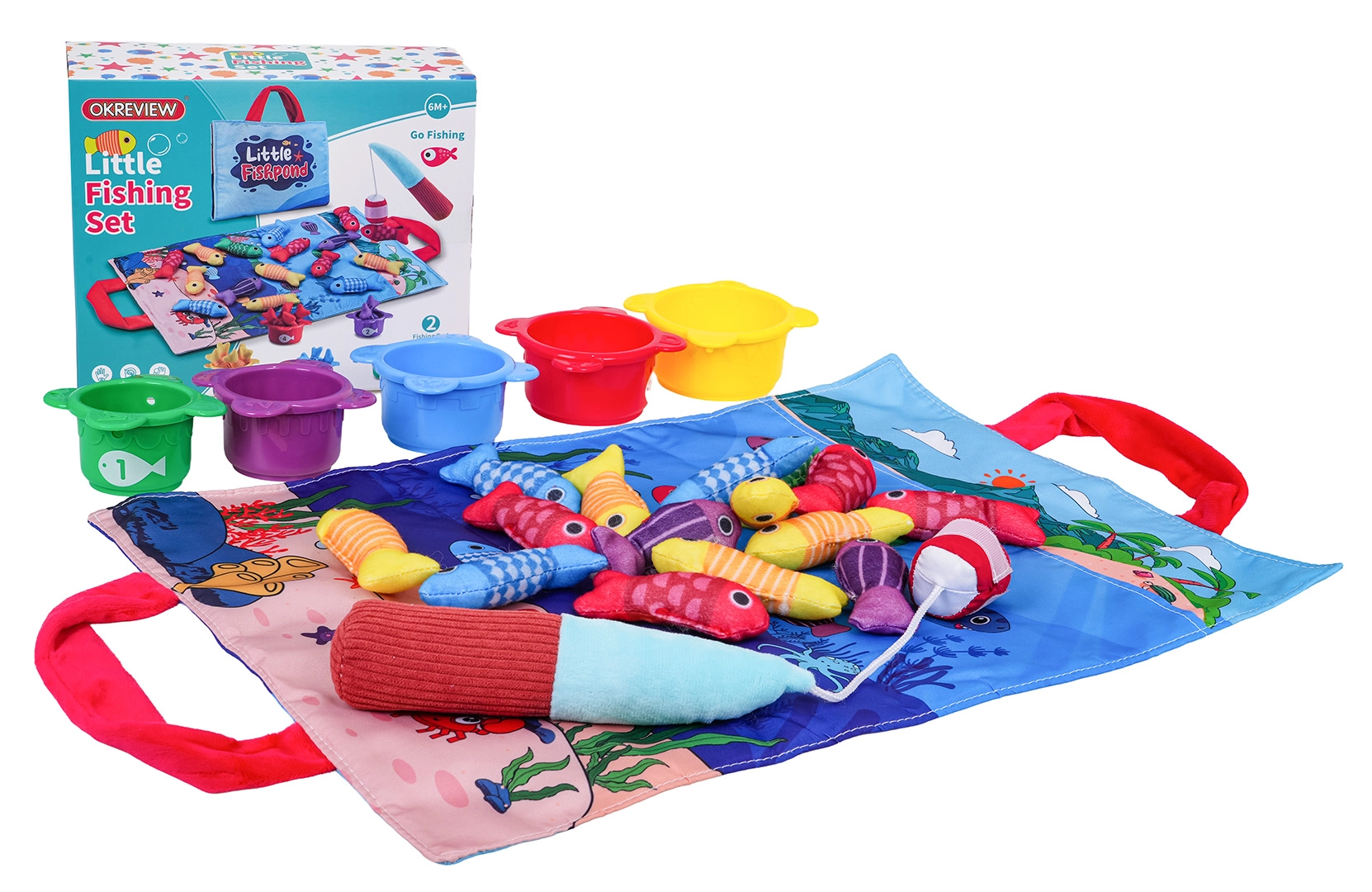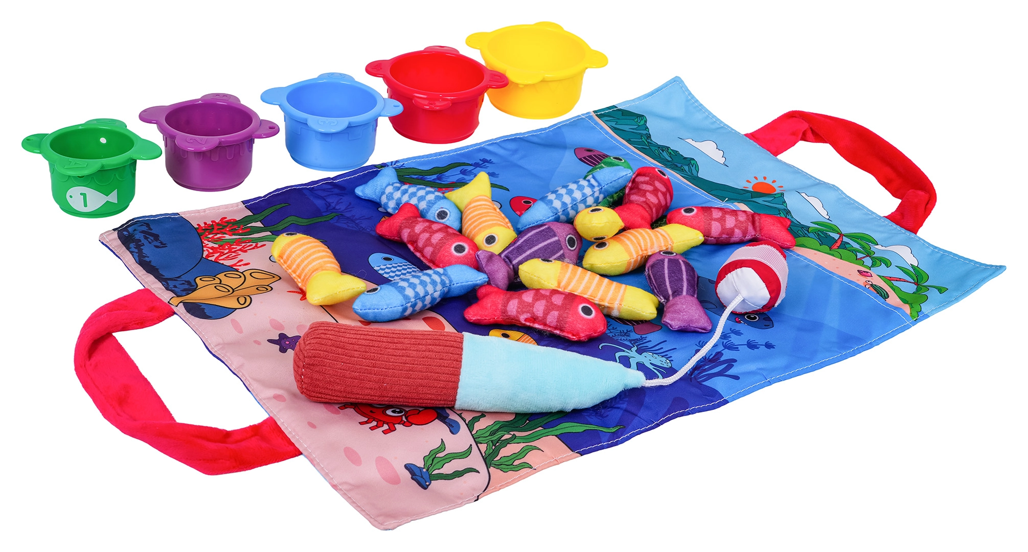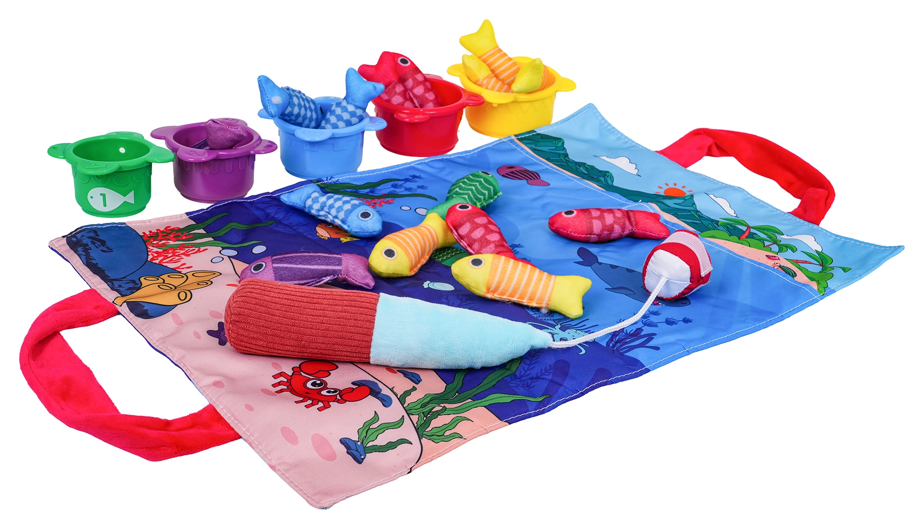 Stoffmatte mit Griffen, 15 weiche Fische (5 gelbe, 4 rote, 3 blaue, 2 violette, 1 grüne), 5 Becher (rot, gelb, blau, grün, violett), weiche Klett-Angelrute