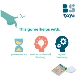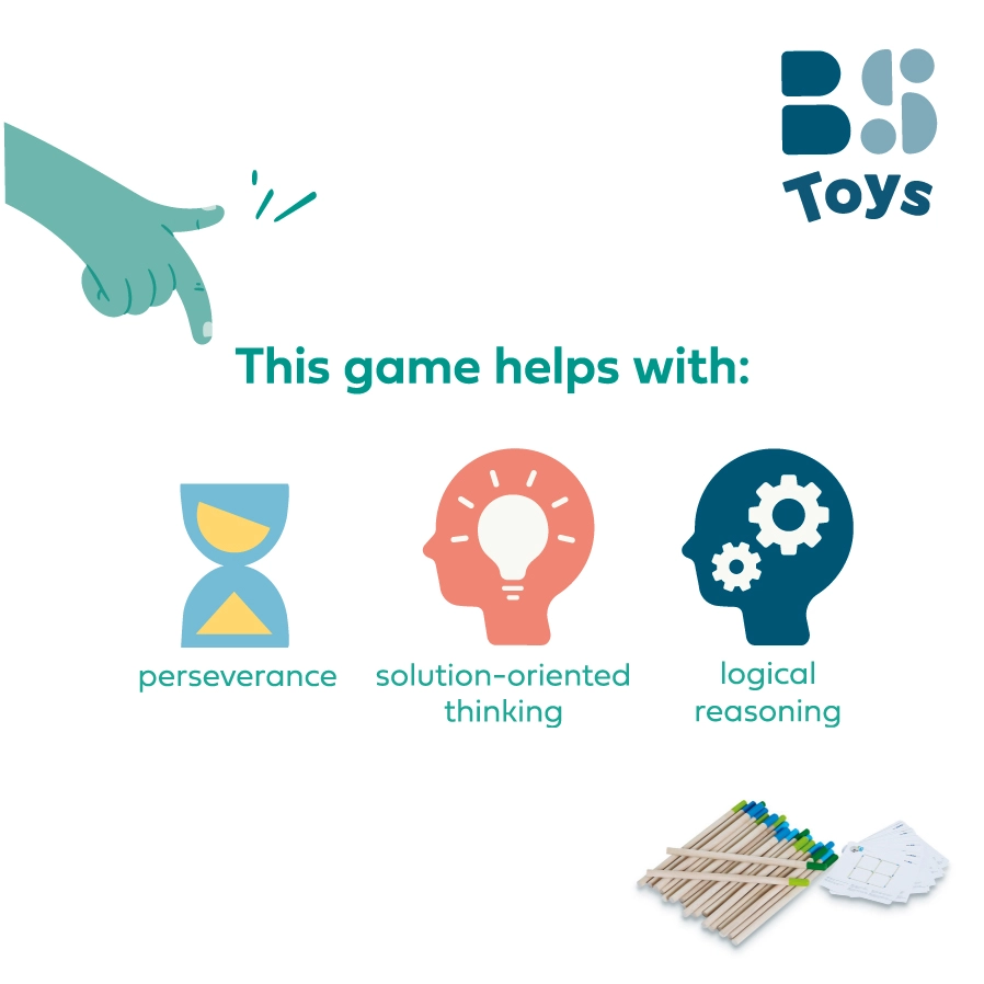 Packungsinhalt: 24 Holzstäbchen mit farbigen Enden (21 × 0,9 cm), 30 Aufgabenkarten und ein Stoffbeutel zur einfachen Aufbewahrung. Das Spiel unterstützt Ausdauer, lösungsorientiertes Denken und logisches Schlussfolgern.