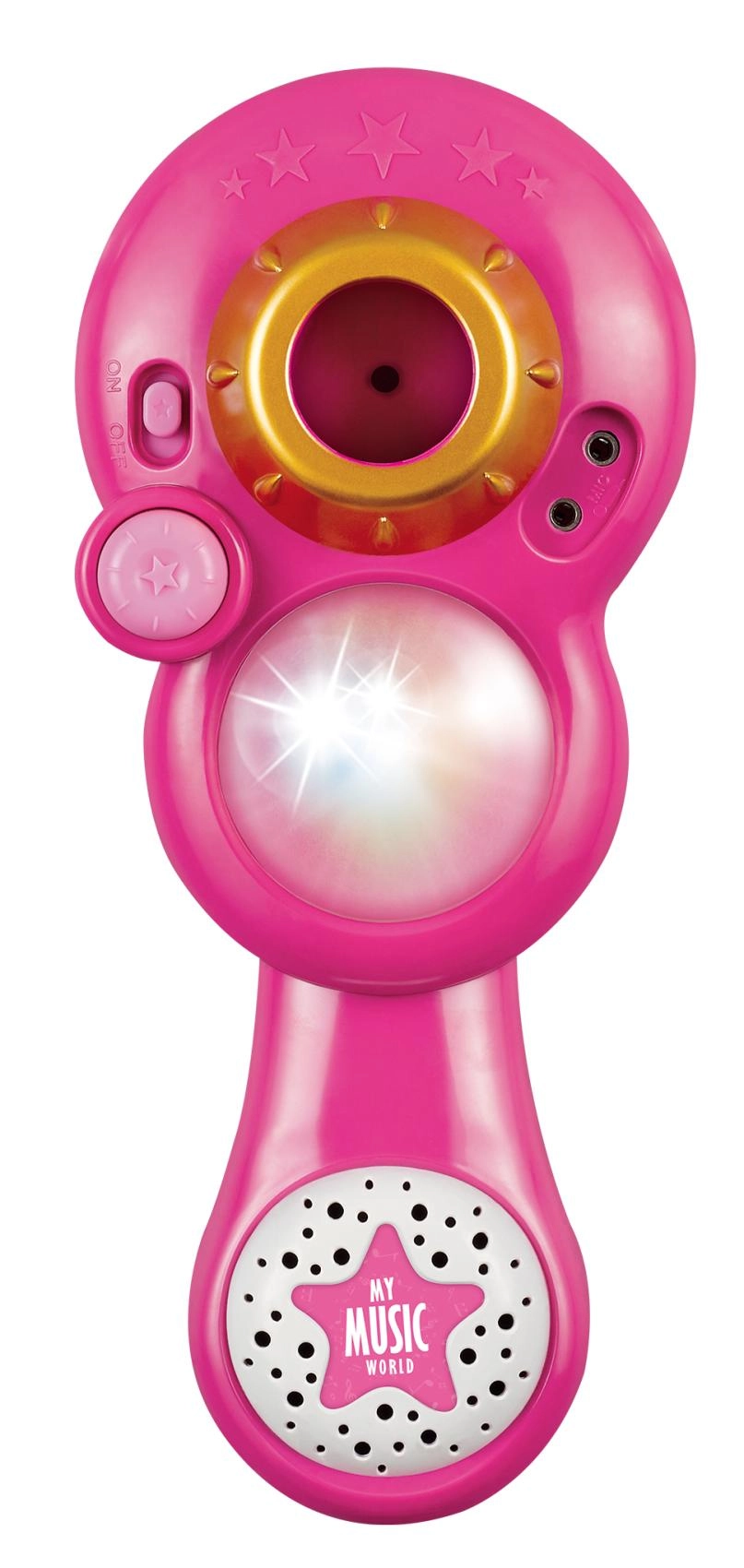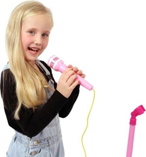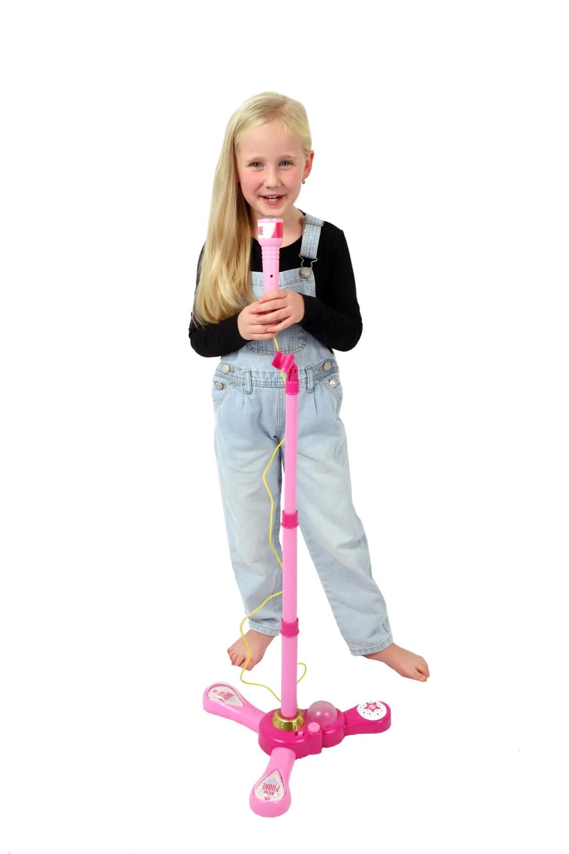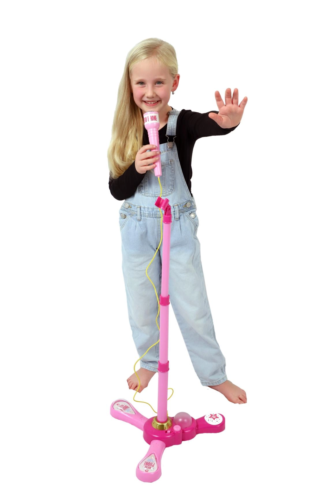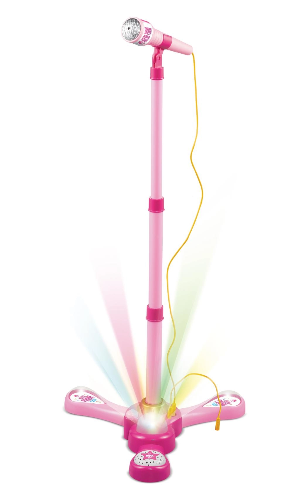 Veranstalten Sie zu Hause eine unvergessliche Karaoke-Show. Dieses rosa Mikrofon mit stabilem Dreibein-Stativ begeistert mit Lichteffekten und spielt 12 vorinstallierte Lieder ab. Ein MP3-Player oder ein Mobiltelefon lässt sich problemlos anschließen, um Lieblingshits abzuspielen.