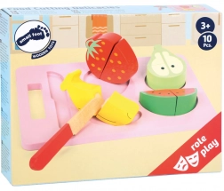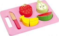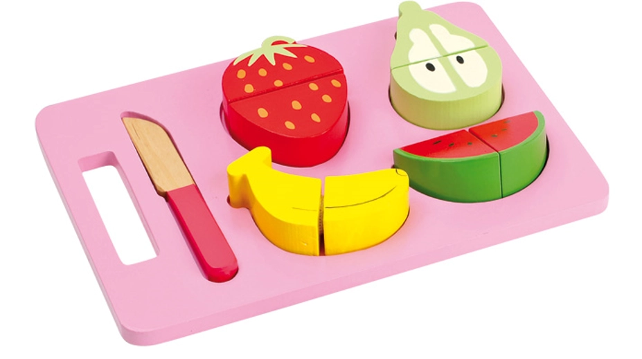 Das Set enthält ein Schneidebrett, ein Holzmesser und vier Obstsorten – Banane, Erdbeere, Birne und Wassermelone. Die hochwertige Holzverarbeitung sorgt für Langlebigkeit und sicheres Spielen ohne scharfe Kanten.
