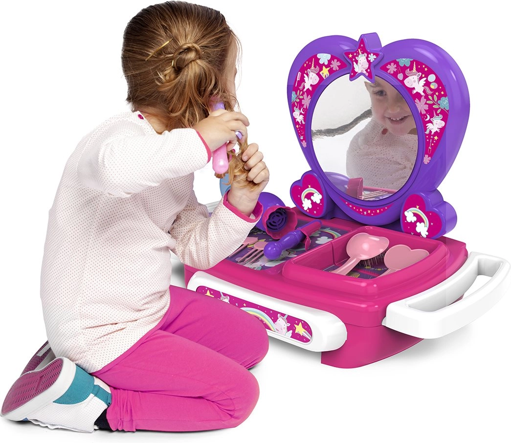 Schenken Sie Kindern eine Welt der Fantasie und des Rollenspiels mit diesem zauberhaften Kosmetiktisch – ideal zum Kämmen, „Schminken“ und Pflegen der Haare. Dank des großen Spiegels und des übersichtlichen Stauraums sind alle Accessoires stets griffbereit.