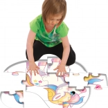 Dieses Konturenpuzzle in Einhornform begeistert alle kleinen Märchenfans. Das fertige Bild misst etwa 53 × 55 cm, ist gut erkennbar, übersichtlich und lässt sich wunderbar auf dem Boden legen. Größere Teile liegen auch kleinen Kinderhänden bequem in der Hand.