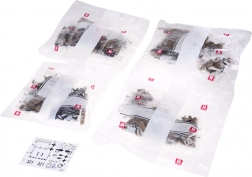 Die Packung enthält eine übersichtliche, illustrierte Anleitung und Aufkleber für die finalen Details. Die Teile sind ordentlich in Beuteln sortiert.