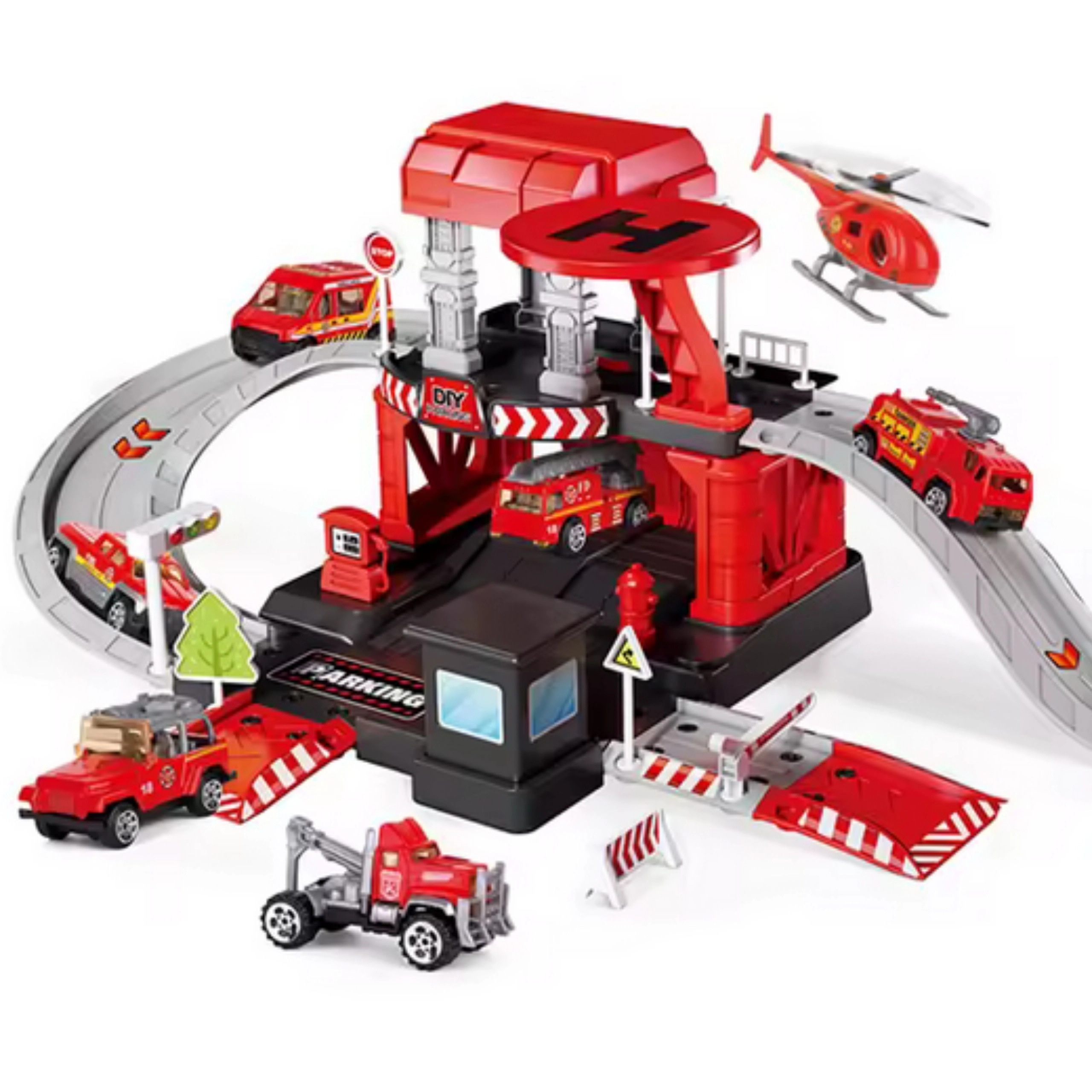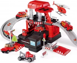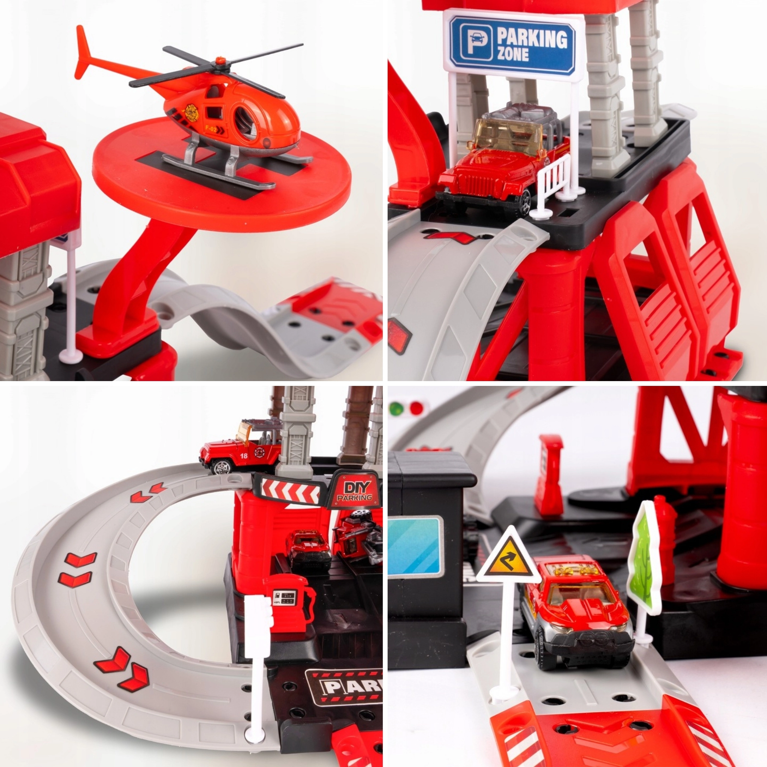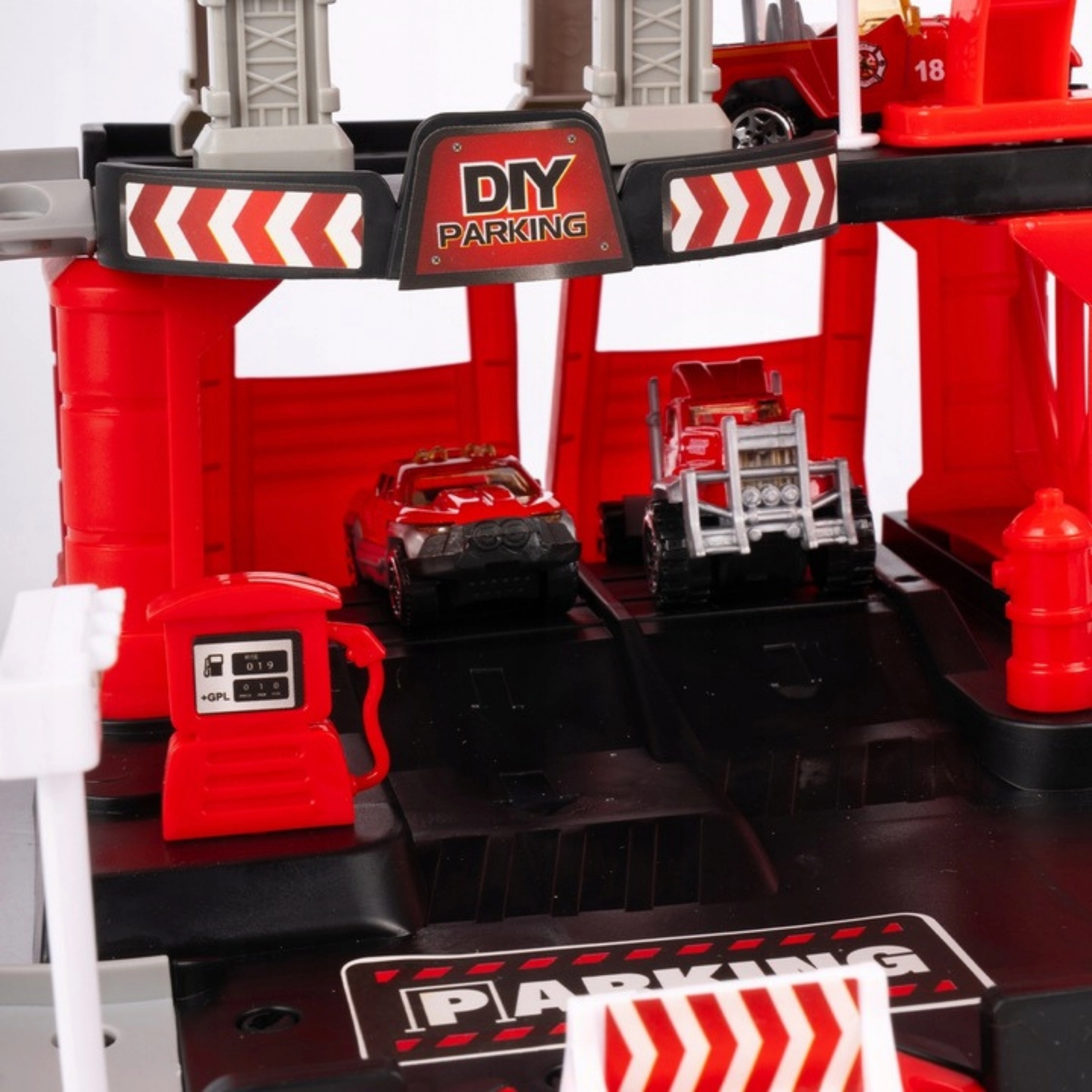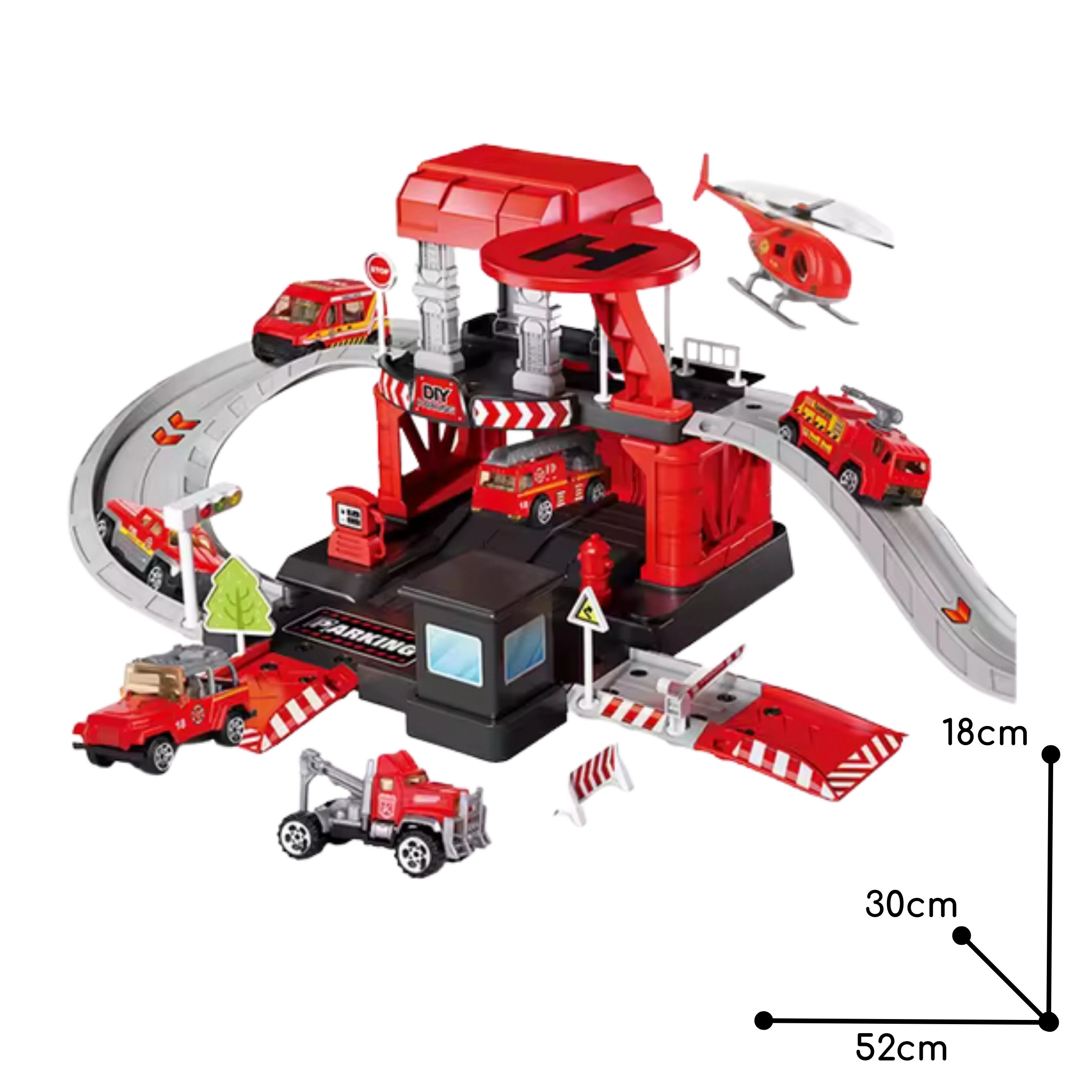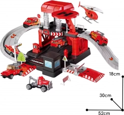• Lieferumfang: zweistufiger Parkplatz mit Rampen und Heliport, 3 Metall-Feuerwehrautos (zufällige Modelle), 1 Feuerwehr-Hubschrauber, Zubehör (Ampeln, Schilder, Absperrungen, Schranken u. a.).