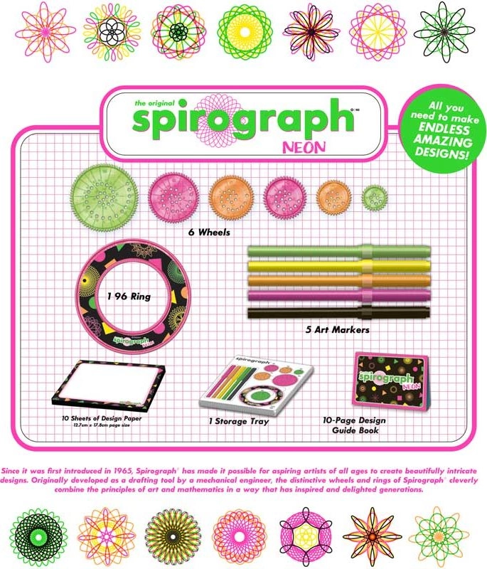 Mit dem Spirograf Neon zaubern Kinder mühelos präzise geometrische Muster, Spiralen und Mandalas, die anschließend ausgemalt werden können. Das Set ist so gestaltet, dass es Kreativität, Kombinationsfähigkeit und Feinmotorik spielerisch fördert.