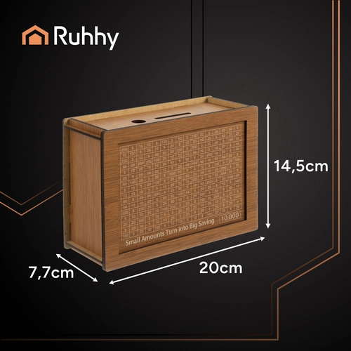 Suchen Sie nach einer Möglichkeit, sich einen finanziellen Habitus anzueignen und mit einem Lächeln zu sparen? Diese hochwertige Holz-Sparbüchse RUHHY mit austauschbaren Karten und dem Aufdruck „10 000“ verwandelt das Geldzurücklegen in eine unterhaltsame Herausforderung. Verfolgen Sie Ihren Fortschritt, markieren Sie erfüllte Beträge und dank der verschlossenen Konstruktion gelangen Sie erst nach Erreichen des Ziels an Ihre Ersparnisse. Ein tolles Geschenk und ein praktisches Hilfsmittel für finanzielle Bildung für Kinder und Erwachsene.
