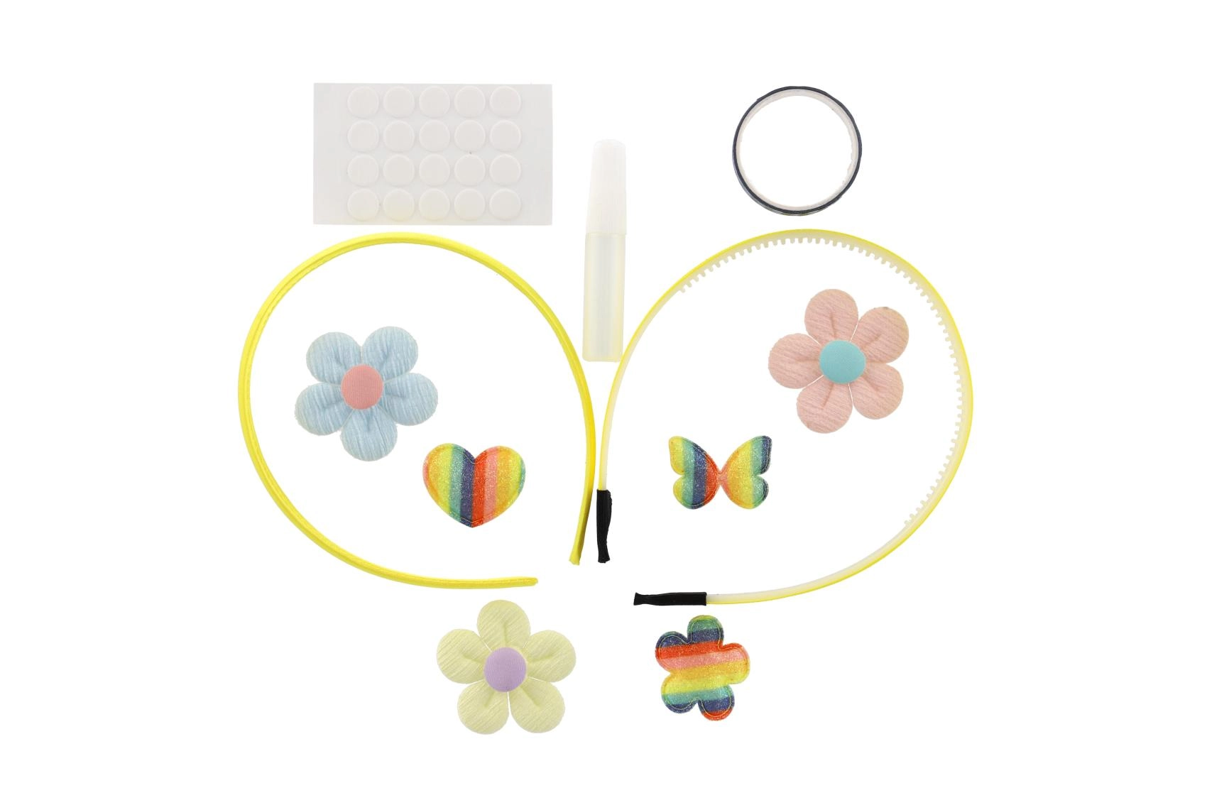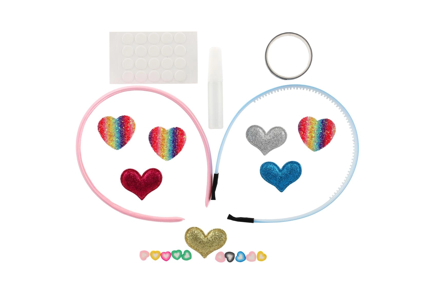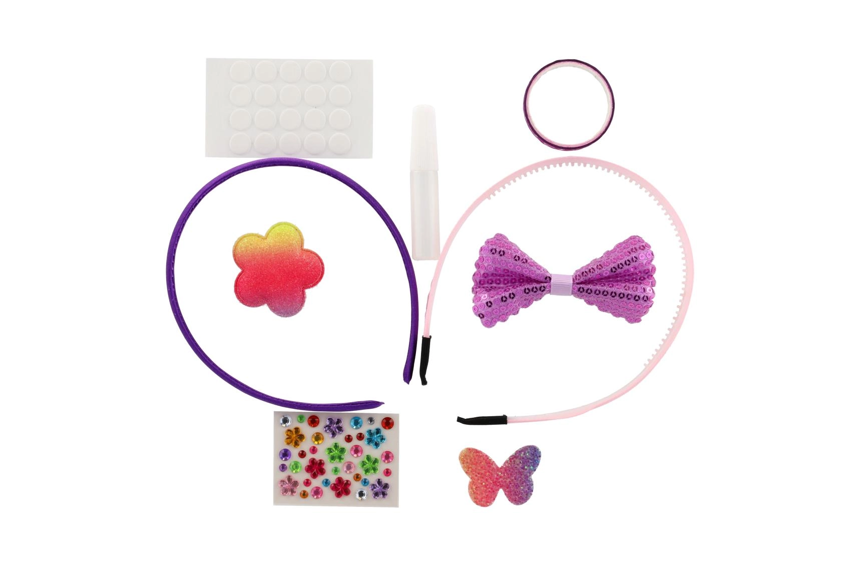 Zwei Kunststoff-Haarreifen, selbstklebende Punkte, ein kleiner Kleber und viele Dekorationen – von glitzernden Applikationen bis zu Steinchen. Einfach öffnen und losdekorieren.