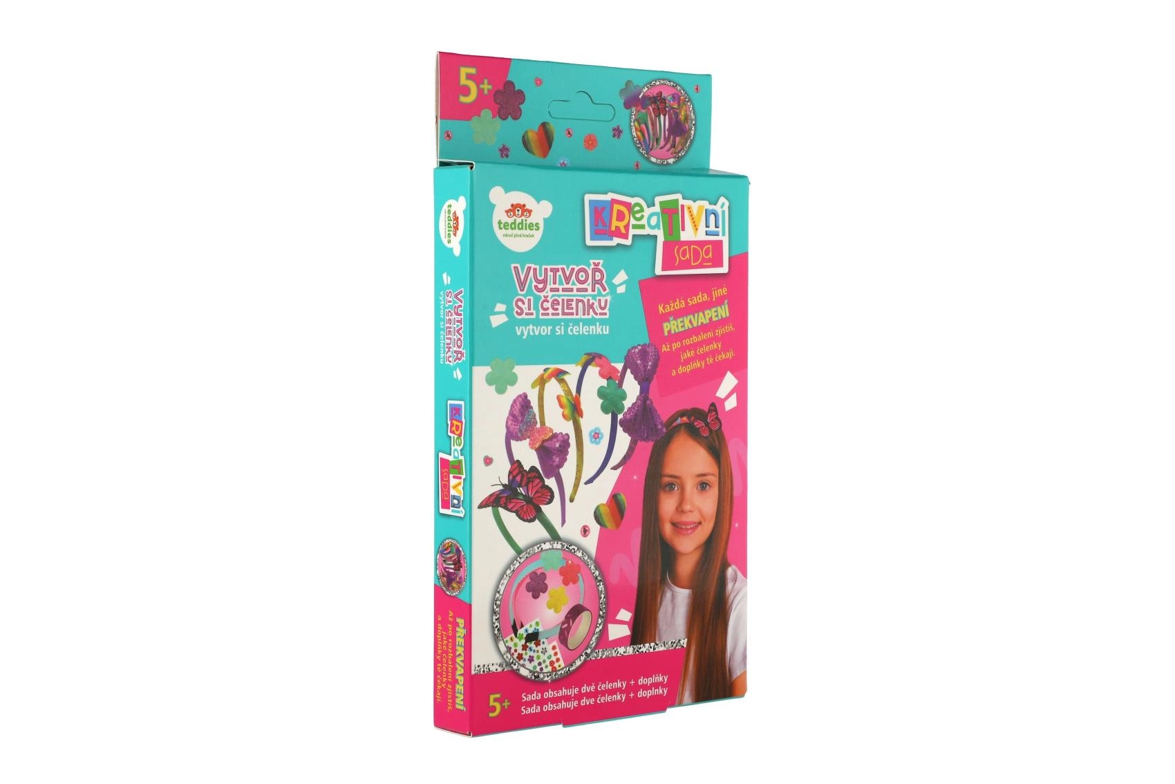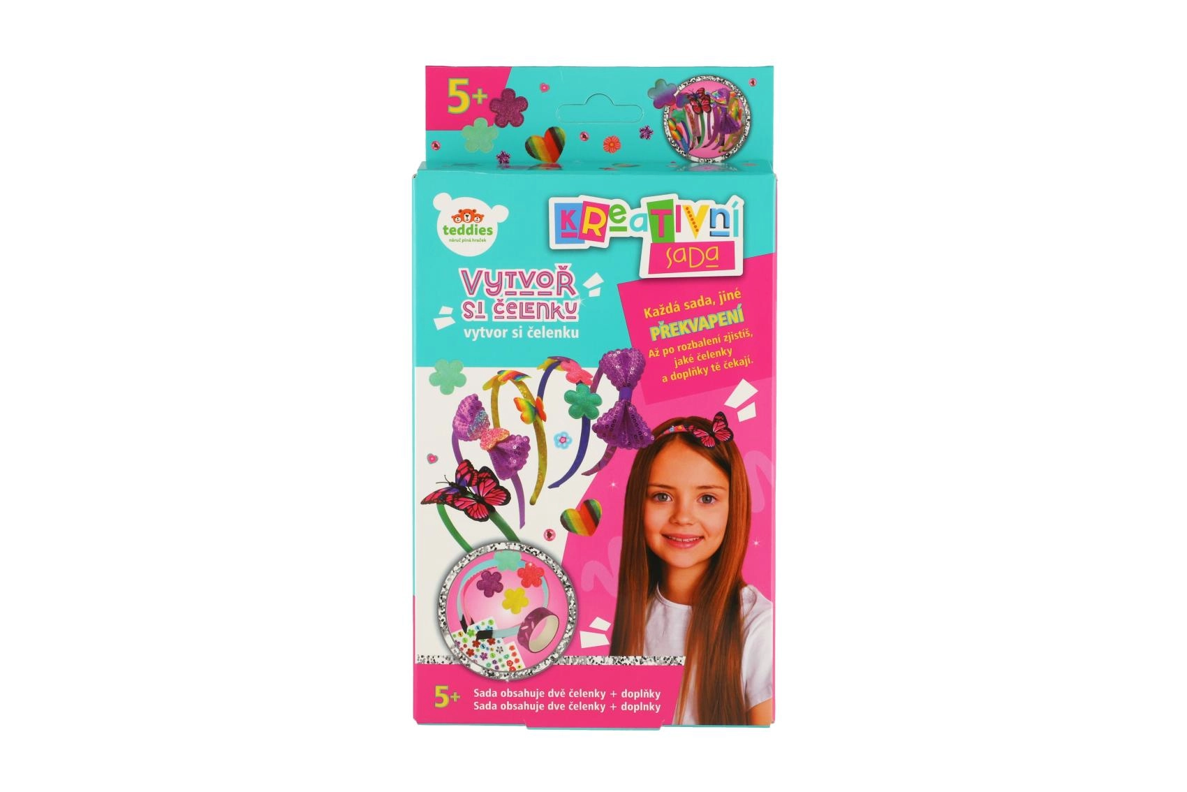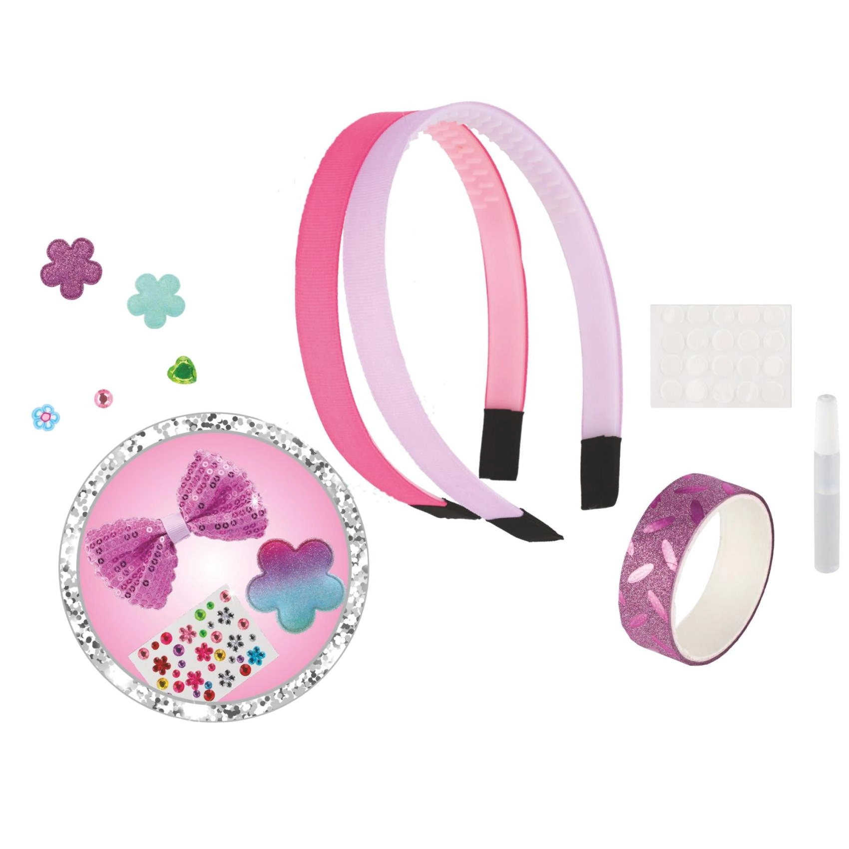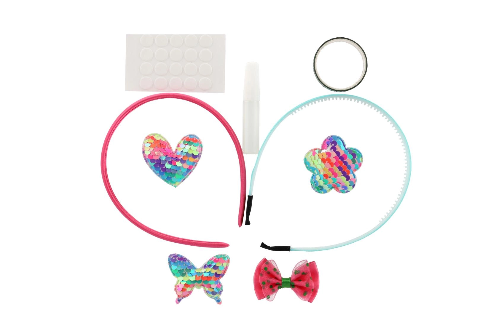 Zwei Kunststoff-Haarreifen, selbstklebende Punkte, ein kleiner Kleber und viele Dekorationen – von glitzernden Applikationen bis zu Steinchen. Einfach öffnen und losdekorieren.