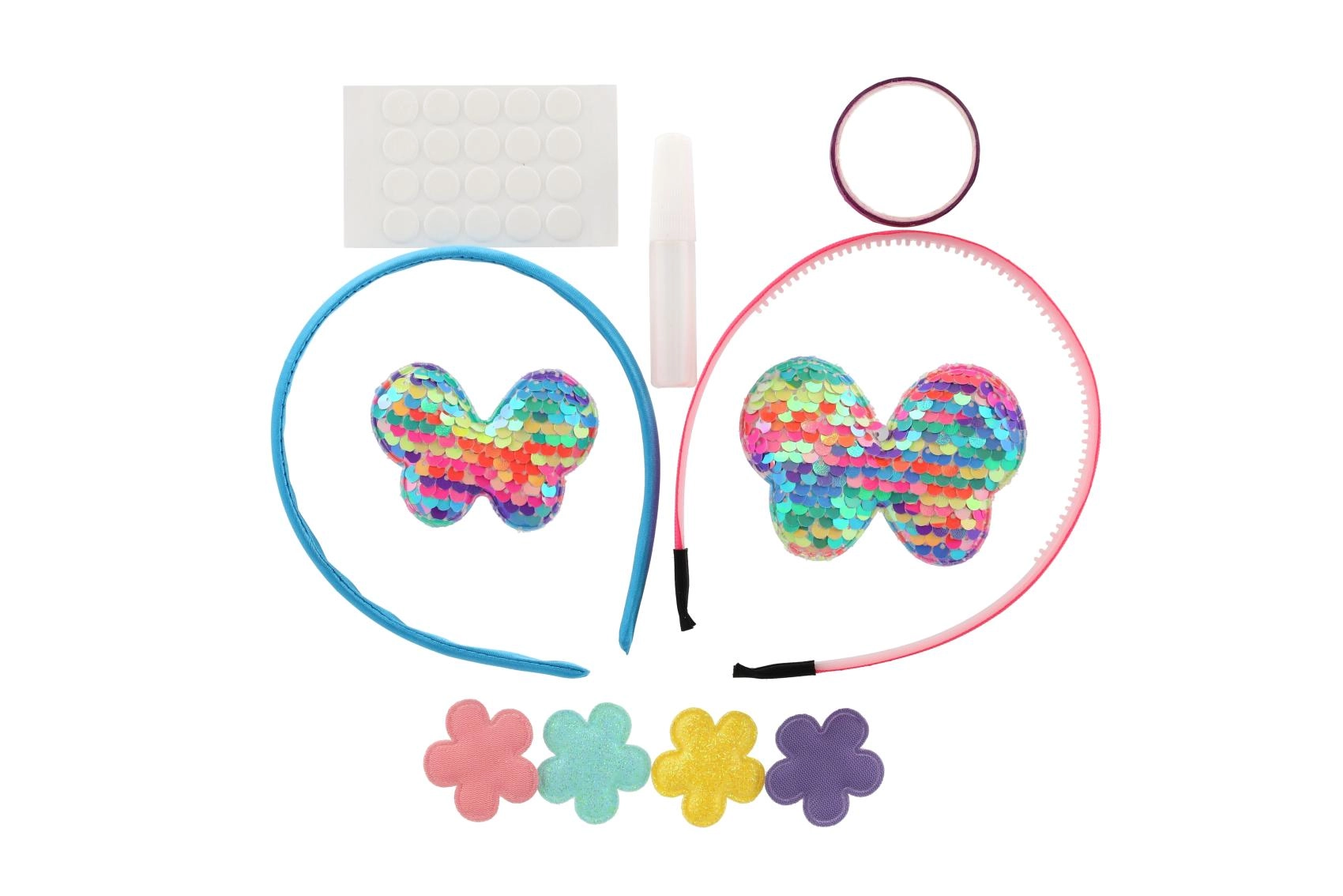 Schmetterlinge, Herzchen und Blümchen mit Pailletten oder Glitzer verleihen dem Haarreif den Wow-Effekt. Kinder gestalten den Look ganz nach ihrer Fantasie.