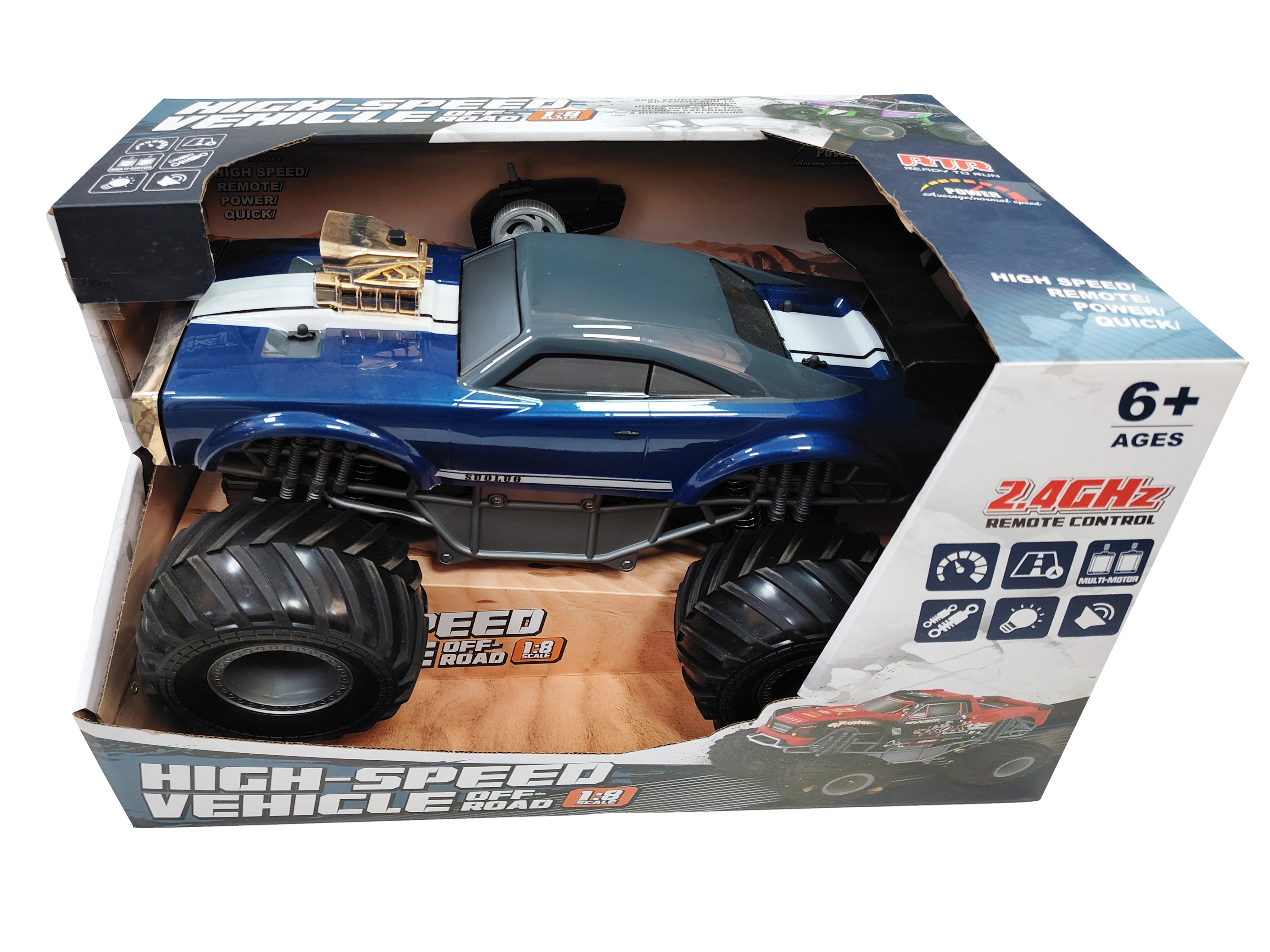 Im Lieferumfang ist alles für den sofortigen Start enthalten – ein 7,4 V 800 mAh Akku-Pack für das Auto und ein USB-Ladekabel. Für den Sender fügen Sie einfach 2× AA-Batterien hinzu (nicht enthalten). Ein praktischer ON/OFF-Schalter befindet sich an der Unterseite des Autos und am Sender.