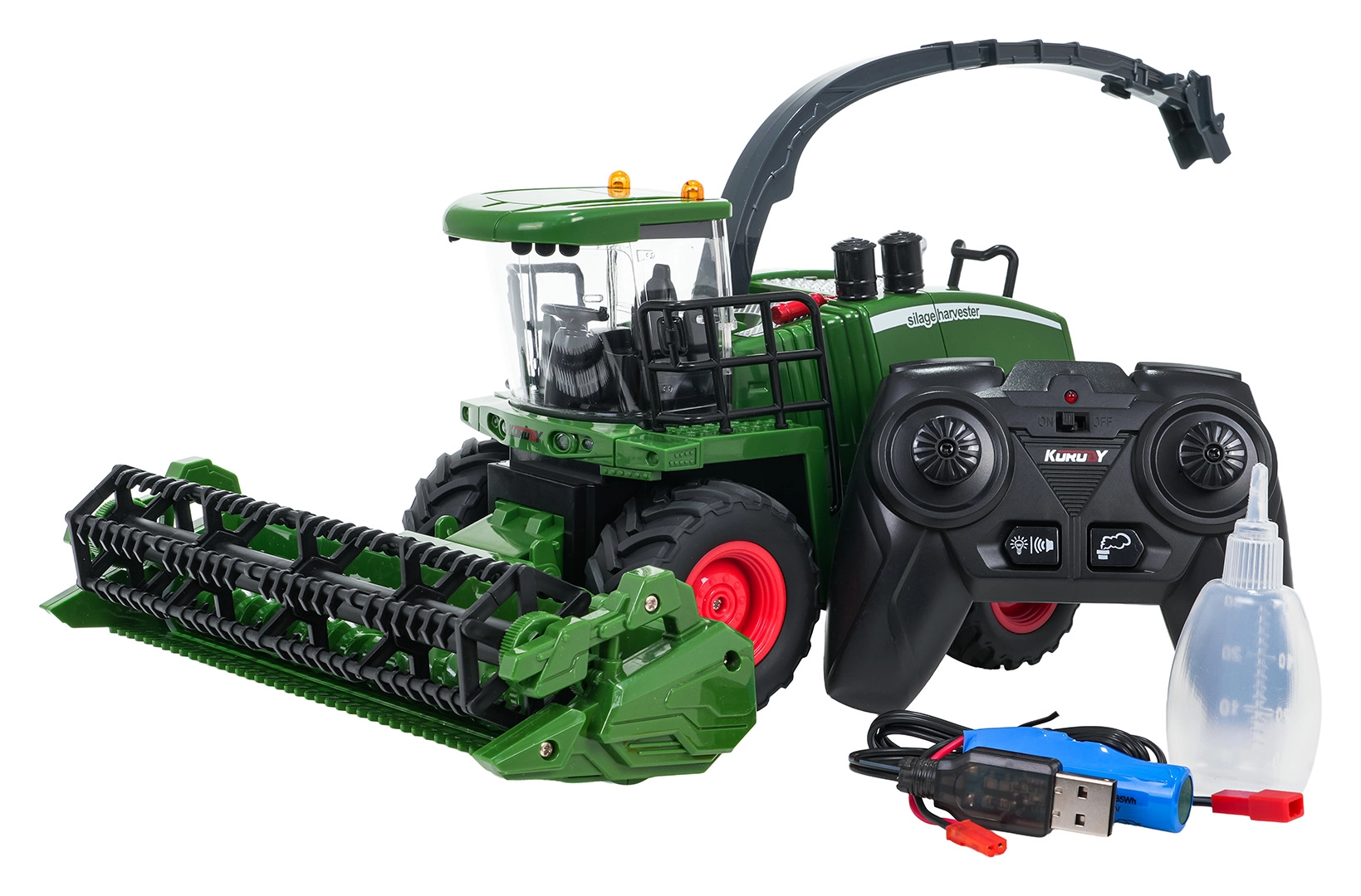 Dieser detailreich gestaltete, spaßige Mähdrescher bietet Kindern authentische Landwirtschafts-Action. Große Gummiräder sorgen für guten Grip, die Schneidtrommel dreht sich während der Fahrt automatisch und der Ausleger lässt sich manuell um 360° drehen. LED-Leuchten an der Kabine und vorne sowie realistische Sounds (Motor, Rückfahrwarner) lassen sich bequem direkt an der Fernsteuerung ein- und ausschalten.