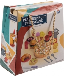 - Pizza, Pizzaschneider, Messer, 2× Hotdog, Hamburger (Brötchen, Salat, Patty), Pommes, Ketchup, Becher mit Trinkhalm, Kanne, 2× Tasse mit Untertasse, Desserts (Sandkuchenform, Donut, Krapfen, 3× Keks), Besteck (Löffel, Messer, Gabel), Geschirr, Anleitung