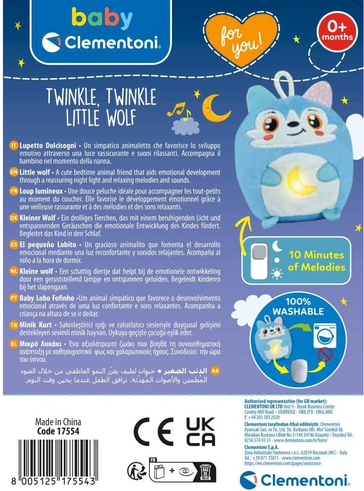 Der interaktive Plüschwolf Twinkle Twinkle ist ein großartiger Begleiter für ruhigen Schlaf und spielerische Stimulation. Sanftes Licht und zarte Melodien fördern das auditive und visuelle Wahrnehmen, während die weiche Oberfläche den Tastsinn entwickelt und Geborgenheit vermittelt. Dank hochwertiger Verarbeitung und zertifizierter Materialien ist das Spielzeug bereits für Neugeborene geeignet.