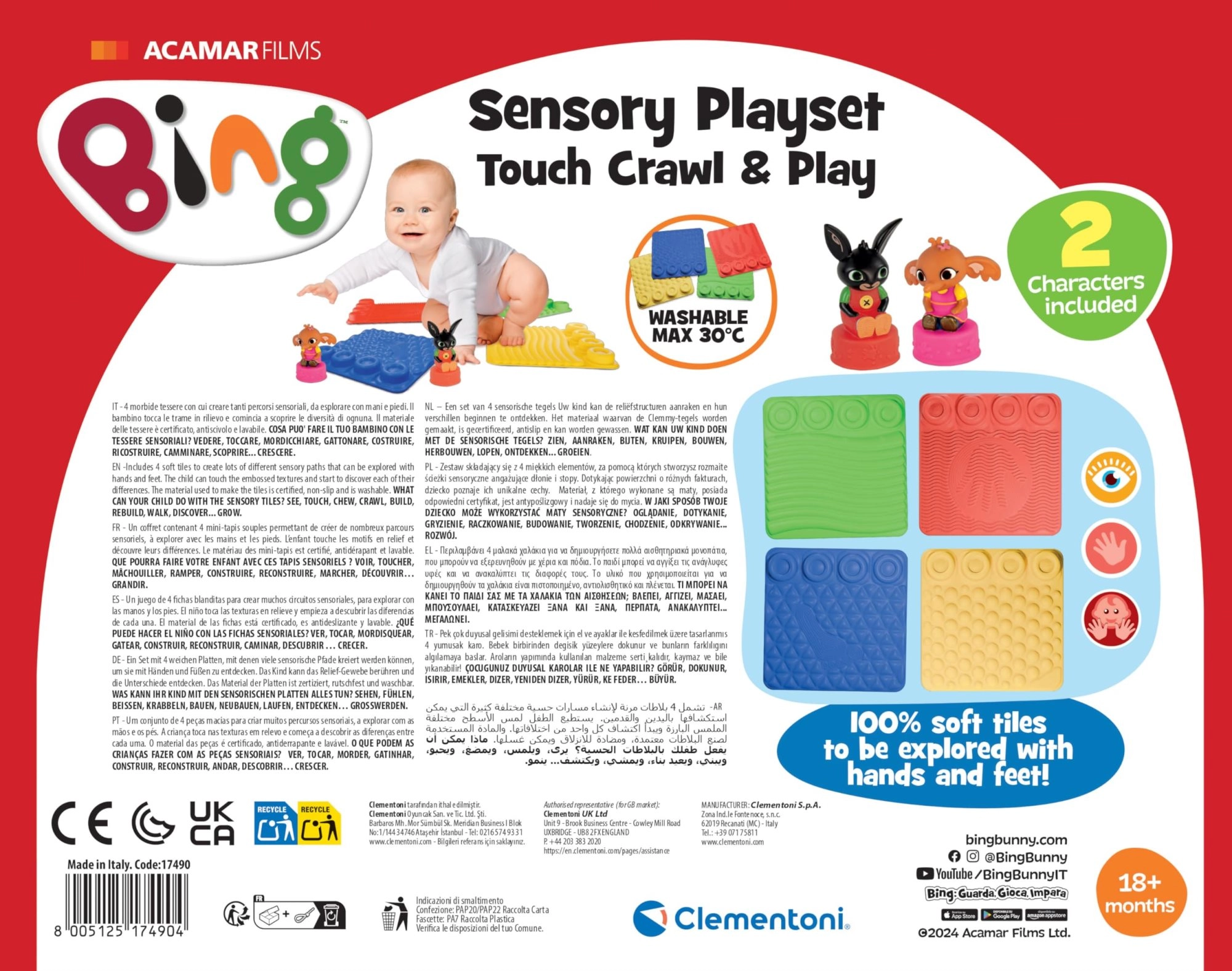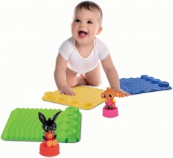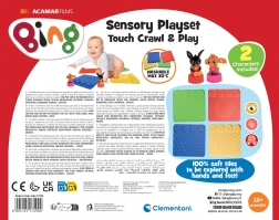 Das Set bietet Kindern ab 18 Monaten eine sichere Umgebung für sensorische Entdeckungen. Unterschiedliche Texturen (Wellen, Punkte, Formen und Spuren) massieren Füße und Handflächen und fördern Gleichgewicht, Konzentration und Farbwahrnehmung. Mit den zwei Figuren aus der Welt von BING erschaffen Kinder eigene Geschichten und entwickeln Fantasie sowie kognitive Fähigkeiten.
