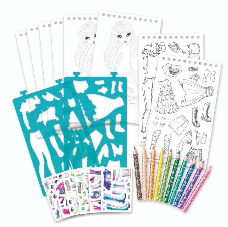 Das Set enthält 20 vorgedruckte Seiten mit Figur, 2 Schablonenseiten mit 28 Kleidungselementen, 6 Stickerbögen (100 Stück), 10 Farbstifte und eine Bildanleitung. Kinder können Kleidung mit den Schablonen nachzeichnen, ausmalen und mit Stickern verzieren – für einzigartige Mode-Kombinationen.