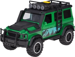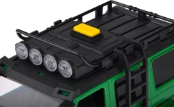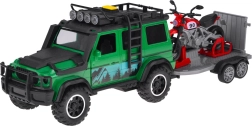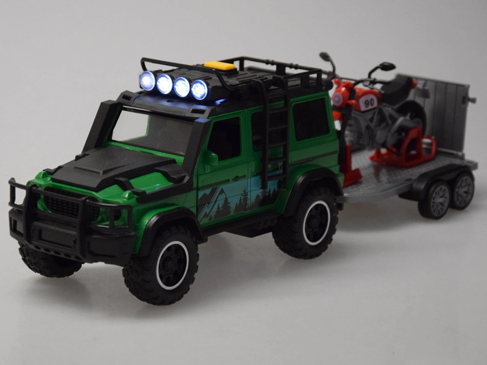 Auf ins Gelände! Dieses detailreiche Set kombiniert ein grünes SUV mit robusten Reifen und Dachgepäckträger mit einem praktischen Anhänger für den Motorradtransport. Realistische Licht- und Soundeffekte sorgen für Atmosphäre, während öffnende Vordertüren und drehbare Gummiräder für viel Spielspaß und sanfte Bewegung auf dem Boden sorgen.