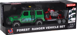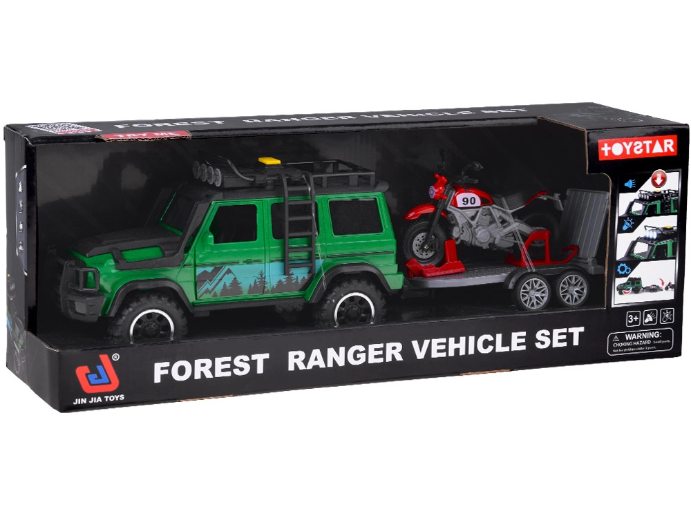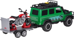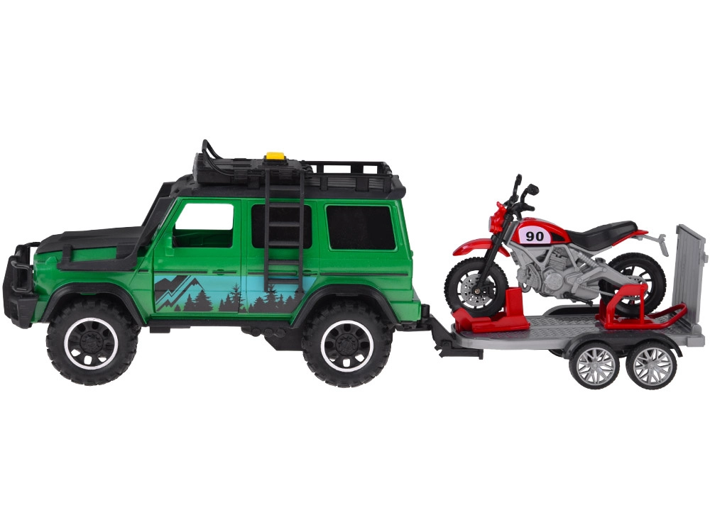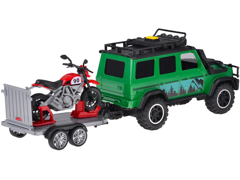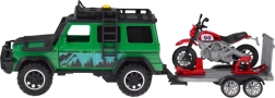 Abenteuerset für kleine Fahrer: grünes Geländewagen mit abnehmbarem Motorradanhänger–Plattform und rotem Sportmotorrad. Das Auto bietet Licht- und Soundeffekte, öffnende Türen und Gummireifen für eine sanfte Fahrt. Der Anhänger hat eine klappbare Heckrampe für einfaches Aufladen und sicheren Transport des Motorrads. Ideal für kreatives Spielen und den Transport weiterer Lieblingsspielzeuge.