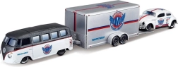 Der Volkswagen Van Samba ist mit einer Anhängerkupplung zum Ankuppeln des Anhängers ausgestattet; der Haken lässt sich bei Bedarf demontieren, der Anhänger kann auch ohne Abschrauben des Hakens abgekoppelt werden. Das gesamte Set ist ideal für Liebhaber klassischer Fahrzeuge, 1:64‑Sammler und Kinder, die kreatives Spielen lieben.