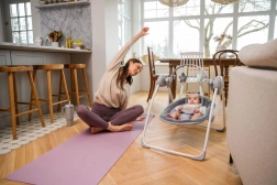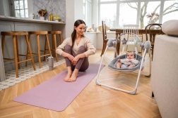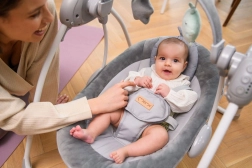 Zum Lieferumfang gehört auch ein Spielbügel mit zwei Spielzeugen zur visuellen und taktilen Stimulation. Die Pflege ist einfach – der Textilbezug ist maschinenwaschbar. Die Stromversorgung ist flexibel dank zweier Betriebsarten (Netz oder Batterien). Das Produkt erfüllt die Normen EN 16232 und EN 71.