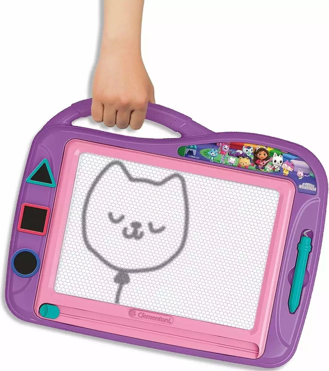 Im Set enthalten sind ein magnetischer Stift und 3 Stempel (Kreis, Dreieck, Quadrat), die das Erlernen von Formen und die Entwicklung der Feinmotorik fördern. Das beliebte Motiv Gabby’s magisches Haus regt zusätzlich zum Rollenspiel an und stärkt die Vorstellungskraft.