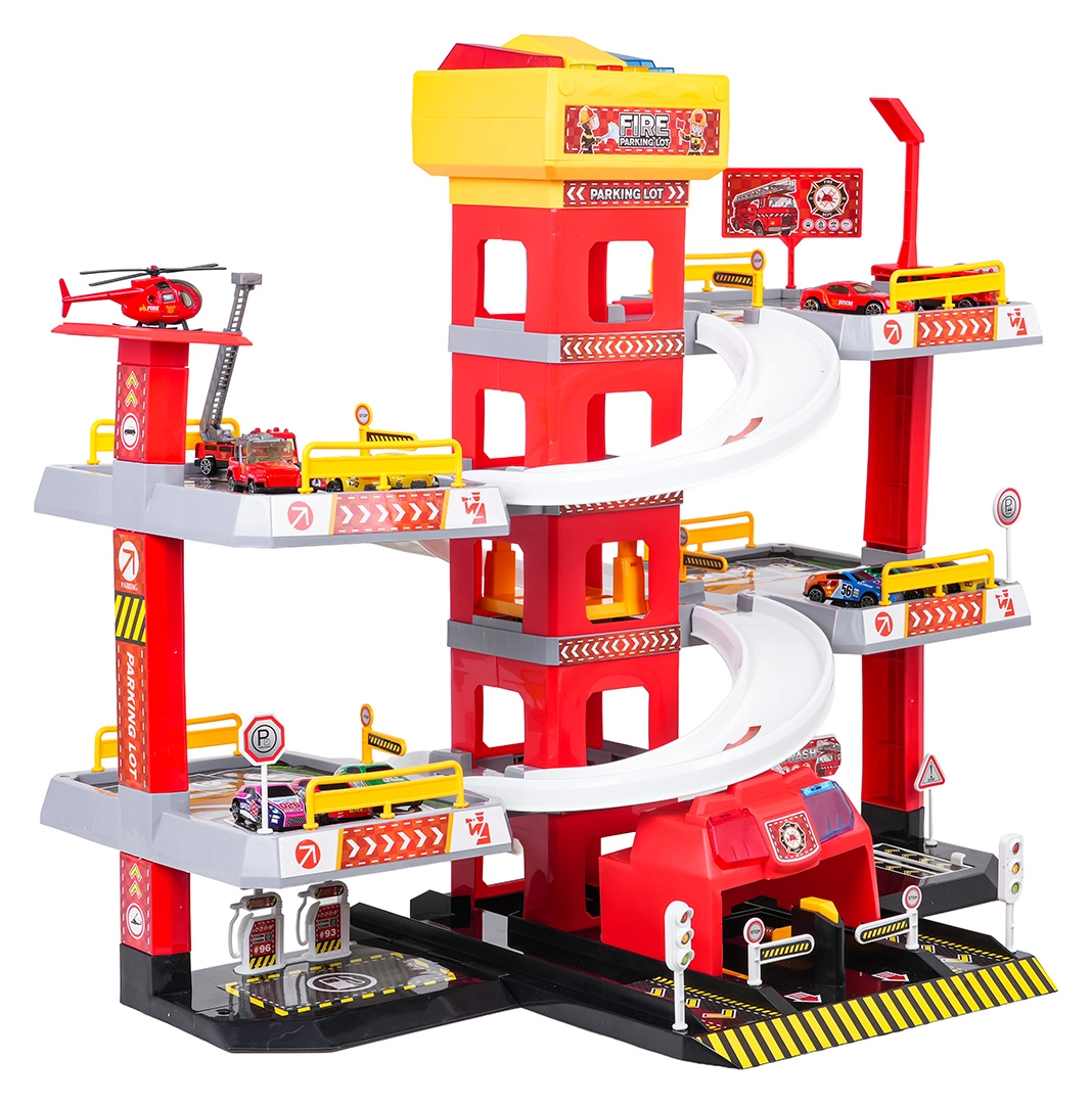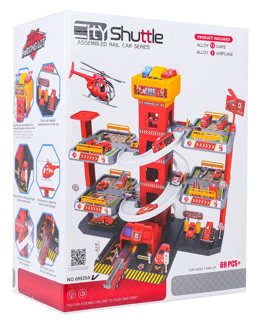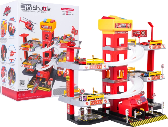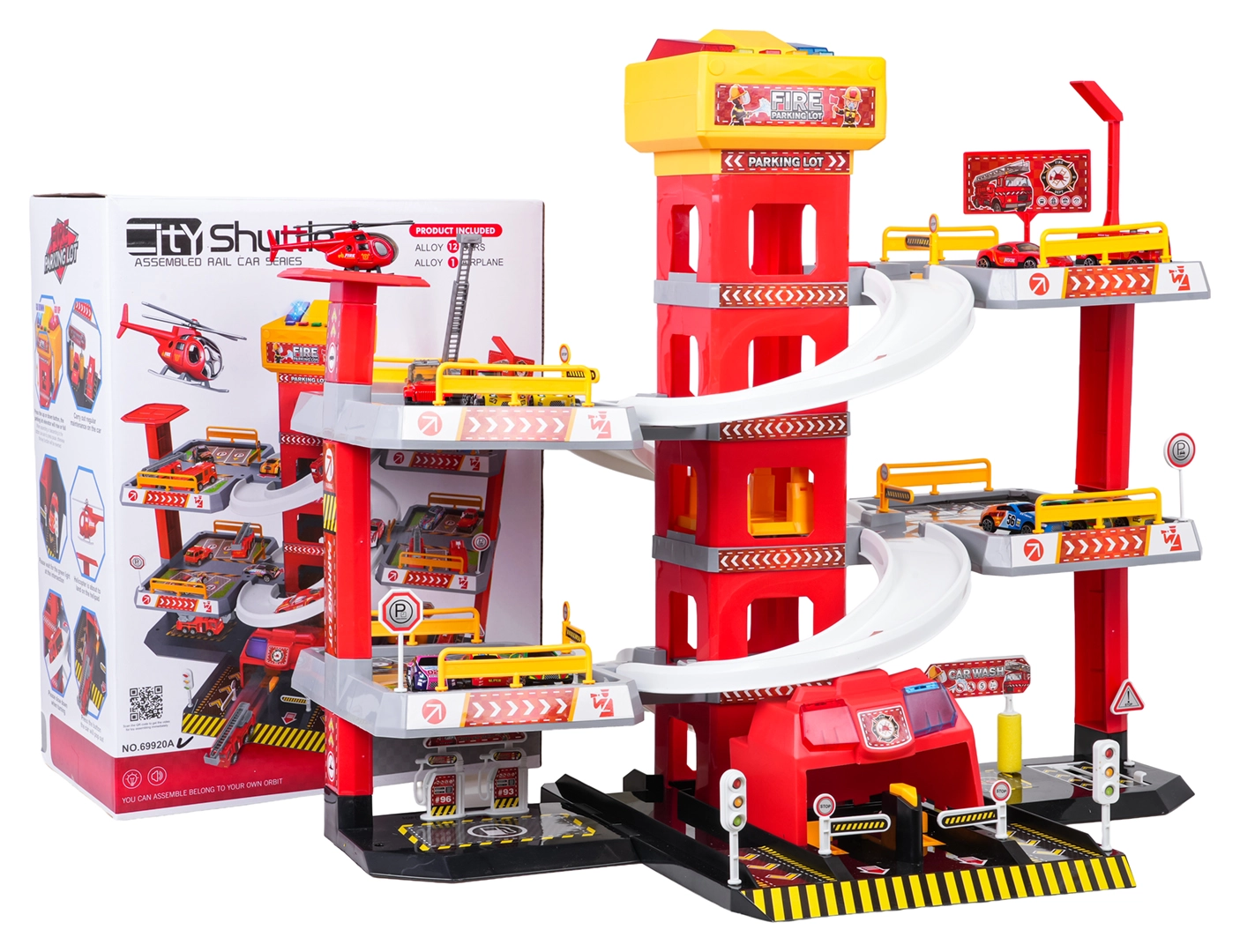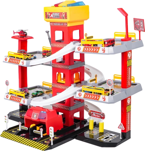 Dieser große, dreistöckige Feuerwehr-Parkplatz bietet Kindern realistischen und actionreichen Spielspaß. Dank des zentralen Turms mit Aufzug lassen sich die Autos bequem zwischen den Ebenen bewegen oder sausen über die geschwungenen Rampen nach unten. Das obere Bedienfeld des Aufzugs verfügt über große Tasten für die Steuerung auf/ab und vier kleinere Tasten für Effekte – Start-, Rückfahr-, Beschleunigungs- und Bremsgeräusche sowie eine Melodie, ergänzt durch blinkende Lichter.