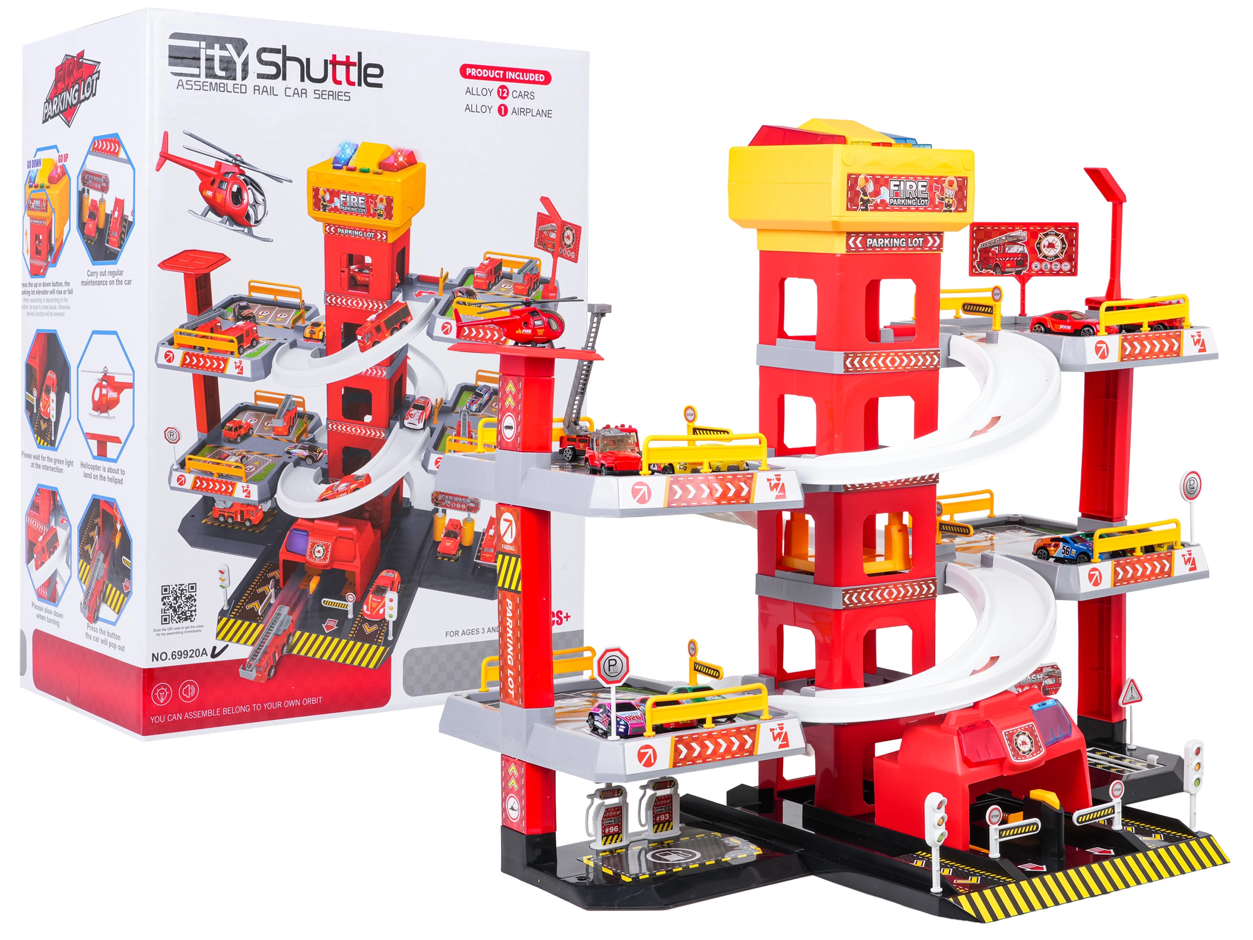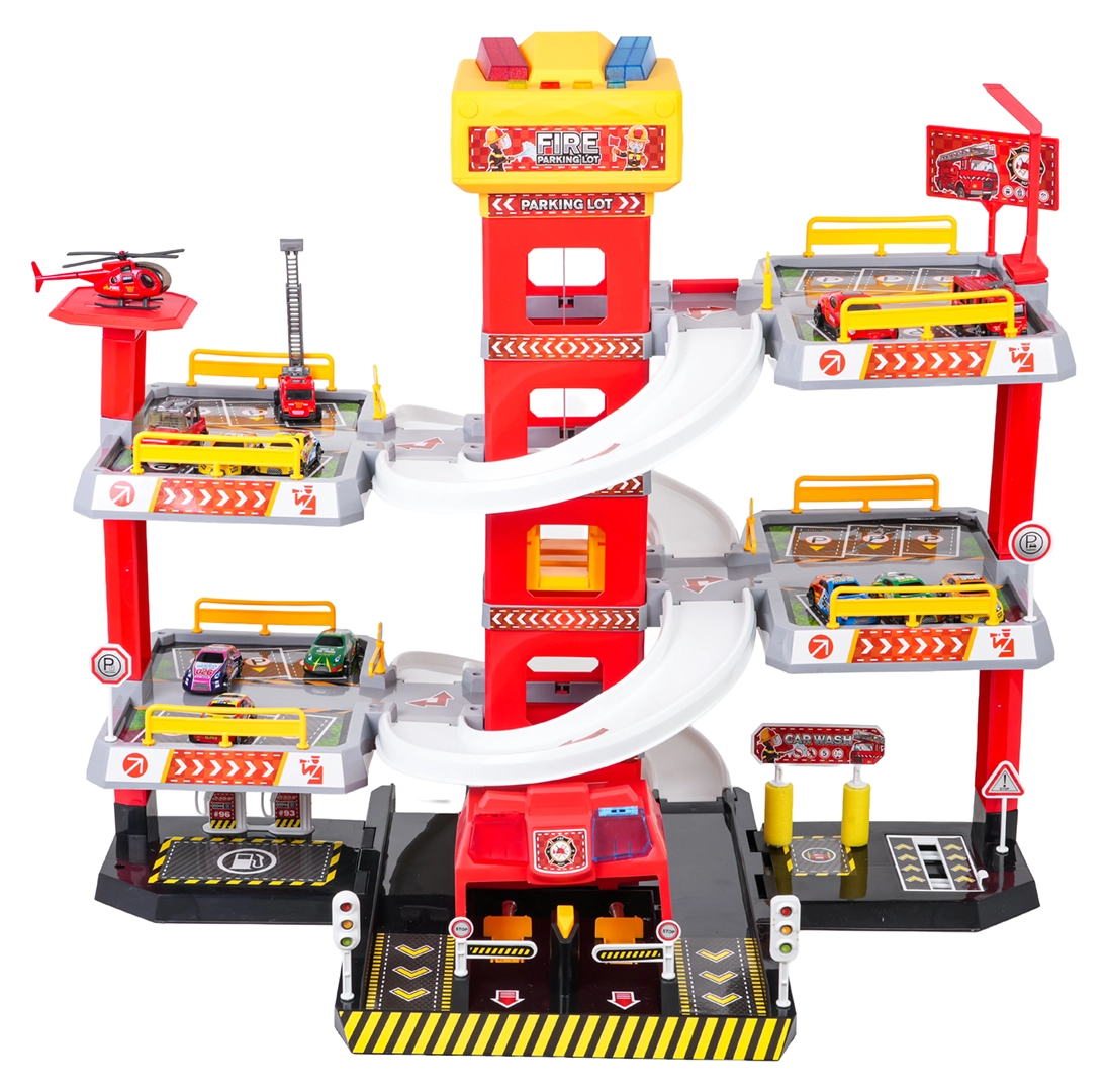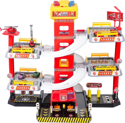 Entdecken Sie Spielspaß für kleine Helden mit einem mehrstöckigen Feuerwehr-Parkplatz mit Spiralrampen, funktionsfähigem Aufzug sowie Licht- und Soundeffekten. Inklusive 12 Autos und Hubschrauber für endlose Rettungsszenarien. Von Waschanlage, Werkstatt und Tankstelle bis zum Helipad – alles in einem Set für Kinder ab 3 Jahren.