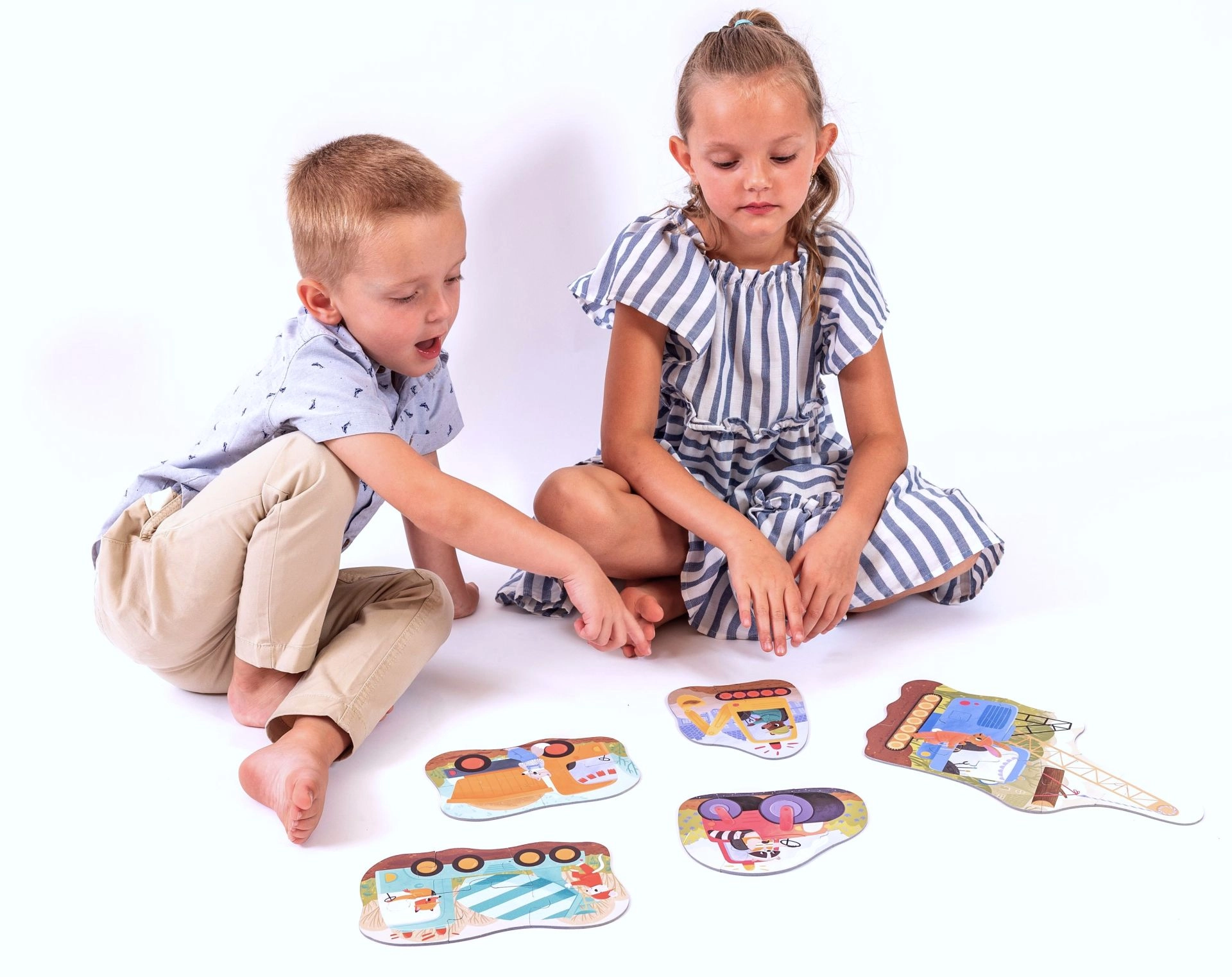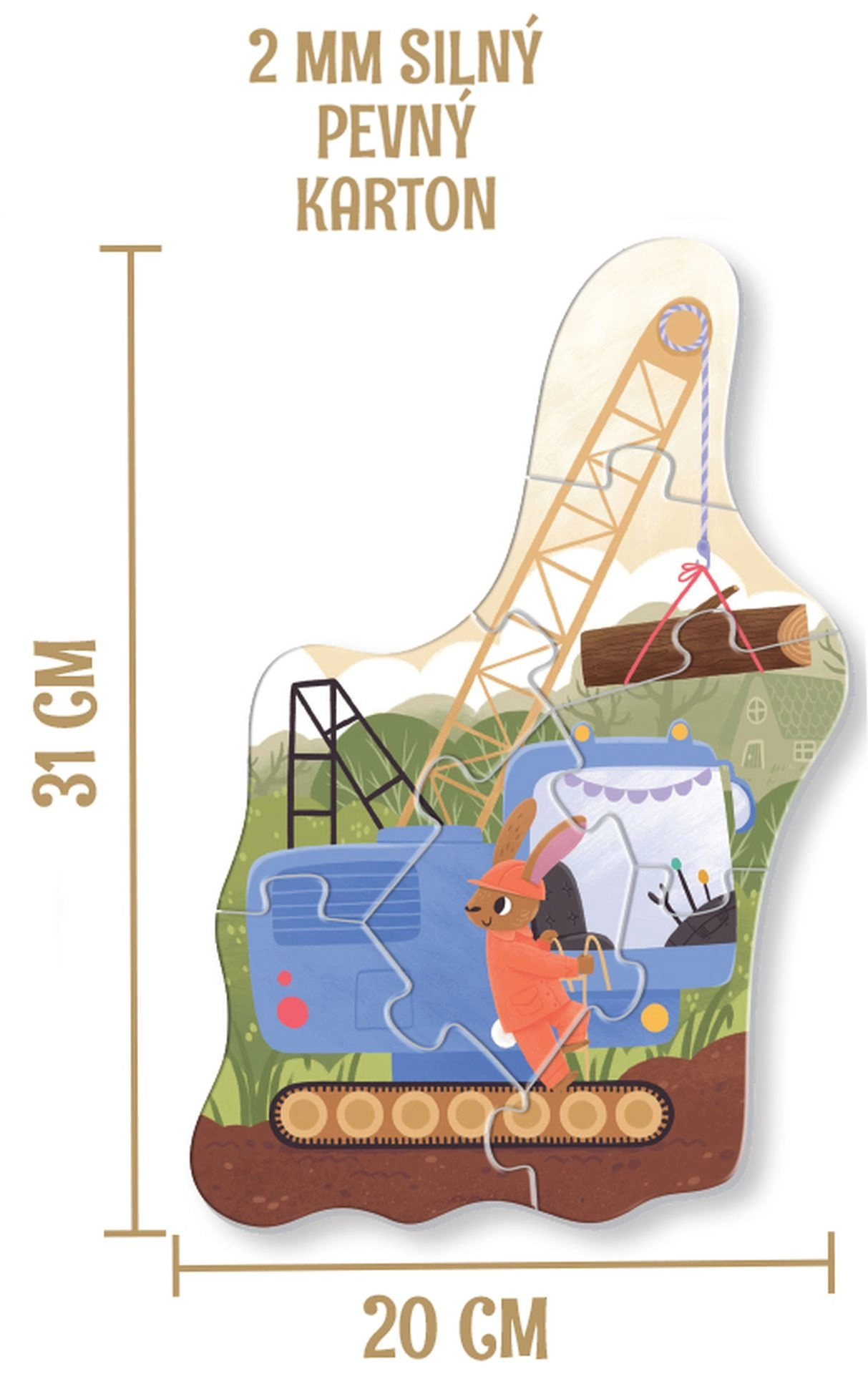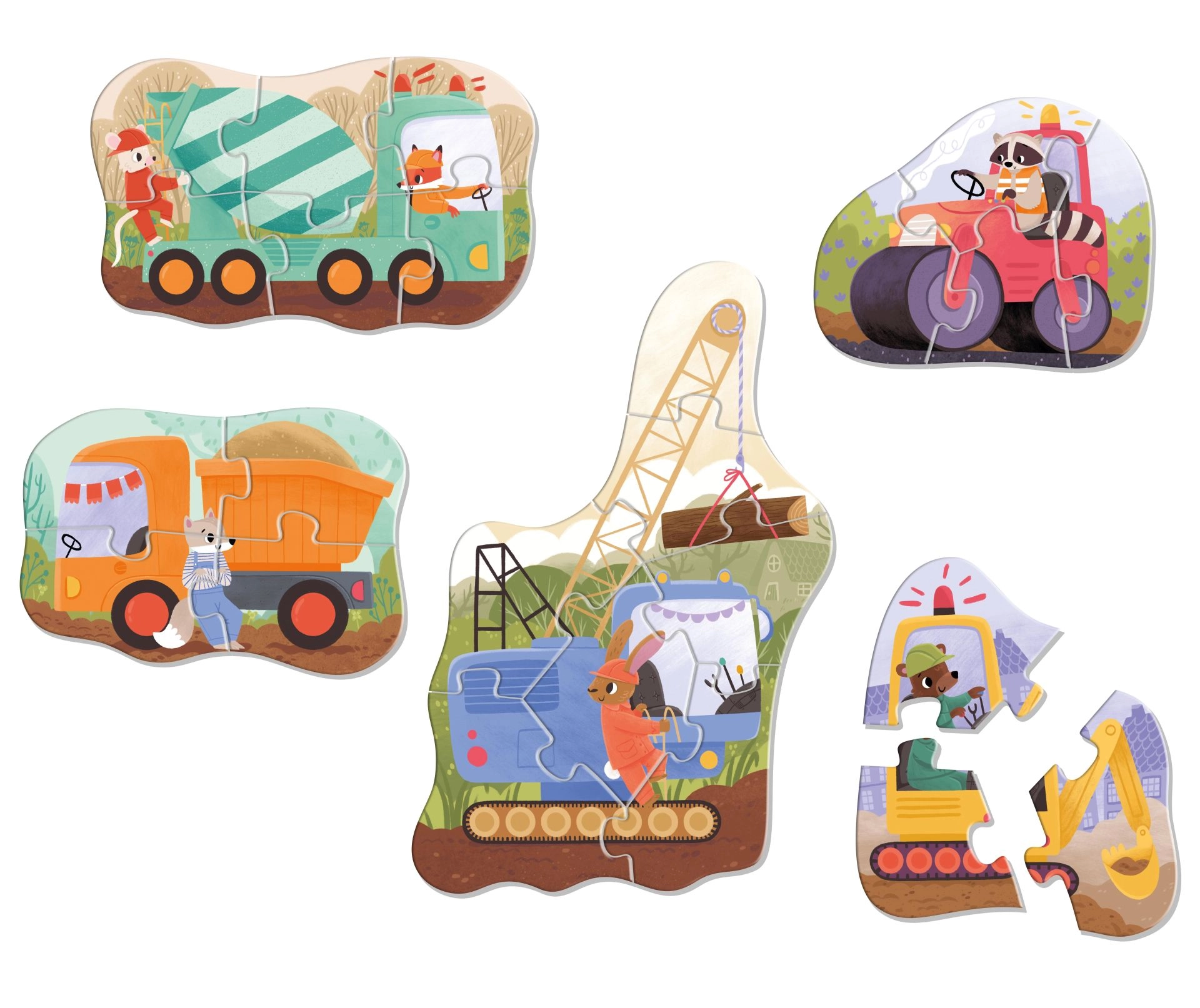 Entdecken Sie fröhliches Puzzeln mit Baumaschinen – von einfachen Zwei- bis hin zu größeren Siebenteile-Puzzles im Format 31 × 20 cm. Dieses Set ist ideal für kleine Fans von Baggern, Mischern und Kränen. Die Teile sind robust, 2 mm dick und leicht zu greifen, sodass Kindern die Handhabung leichter fällt und sie schneller Erfolgserlebnisse haben.