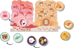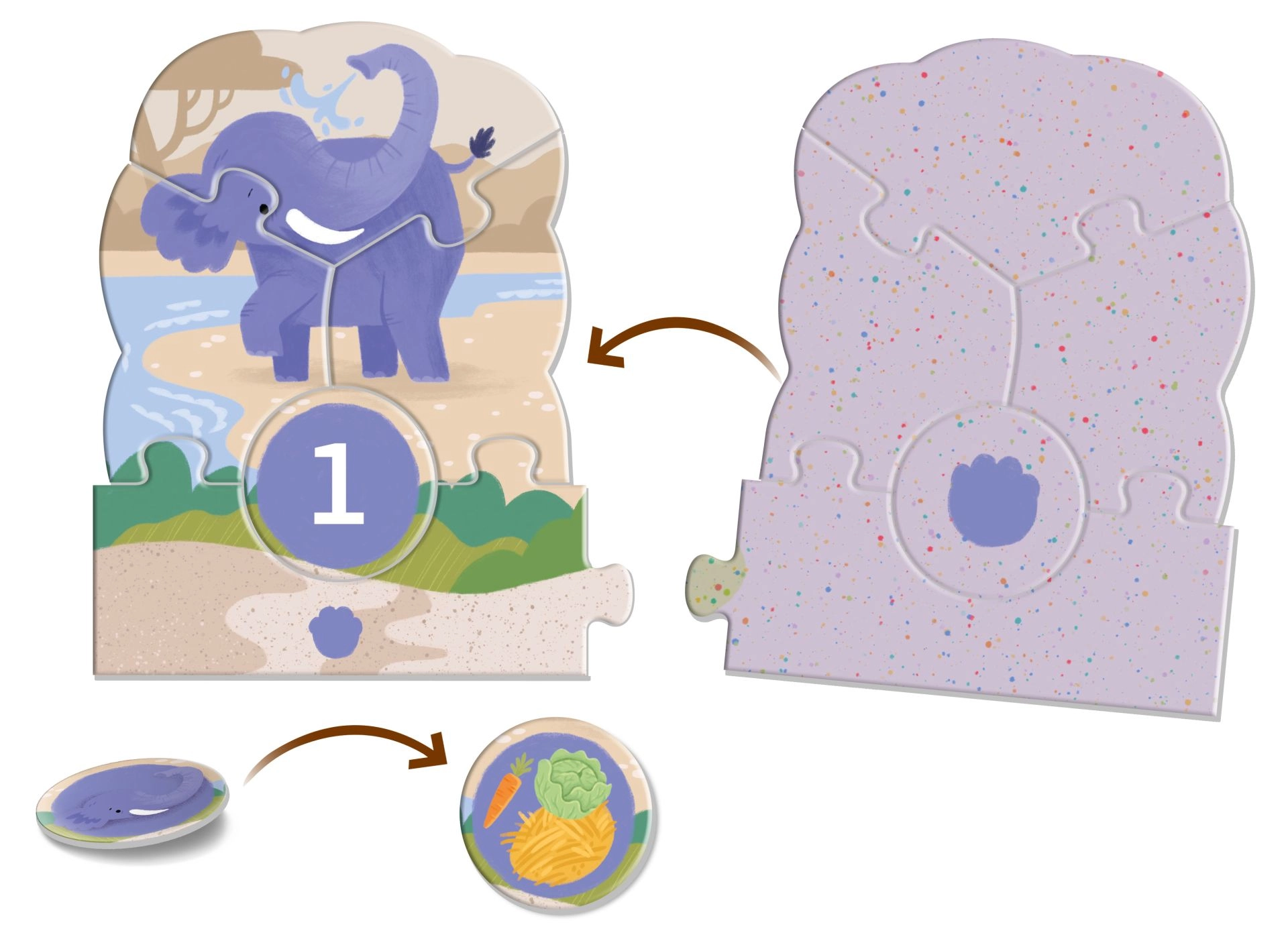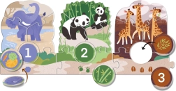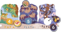 Dieses originelle Lernspiel bringt Kindern ab 2 Jahren Tiere, ihre Spuren und ihr Futter nahe und trainiert zugleich das erste Zählen von 1 bis 10. Die langen Puzzles mit Tiergehegen ergänzen Kinder um passende Marker nach Anzahl, Spur oder Futter und üben so Aufmerksamkeit, Sortieren und Assoziationen.