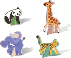Extra große, 2 mm starke Kartonteile lassen sich leicht greifen, passen gut zusammen und halten auch häufigem Spielen stand. Außerdem enthalten sind vier separate Tierfiguren für freies Spiel sowie ein Elternratgeber mit Ideen für Spielvarianten.