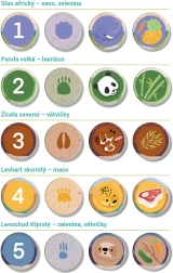 Runde Marker mit Futter und Tierköpfen helfen Kindern, richtig zuzuordnen, was welches Tier frisst und welche Spuren es hinterlässt.